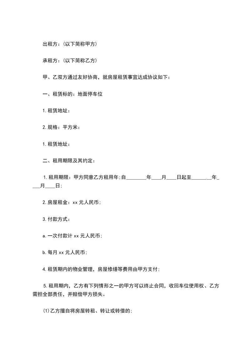 5.租用期内,乙方有下列情形之一的甲方可以终止合同,收回车位使用权、乙方需担全部责任,并赔偿甲方损失。
