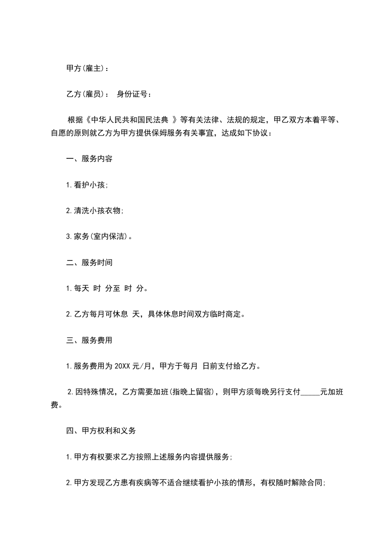 根据《中华人民共和国民法典 》等有关法律、法规的规定,甲乙双方本着平等、自愿的原则就乙方为甲方提供保姆服务有关事宜,达成如下协议: