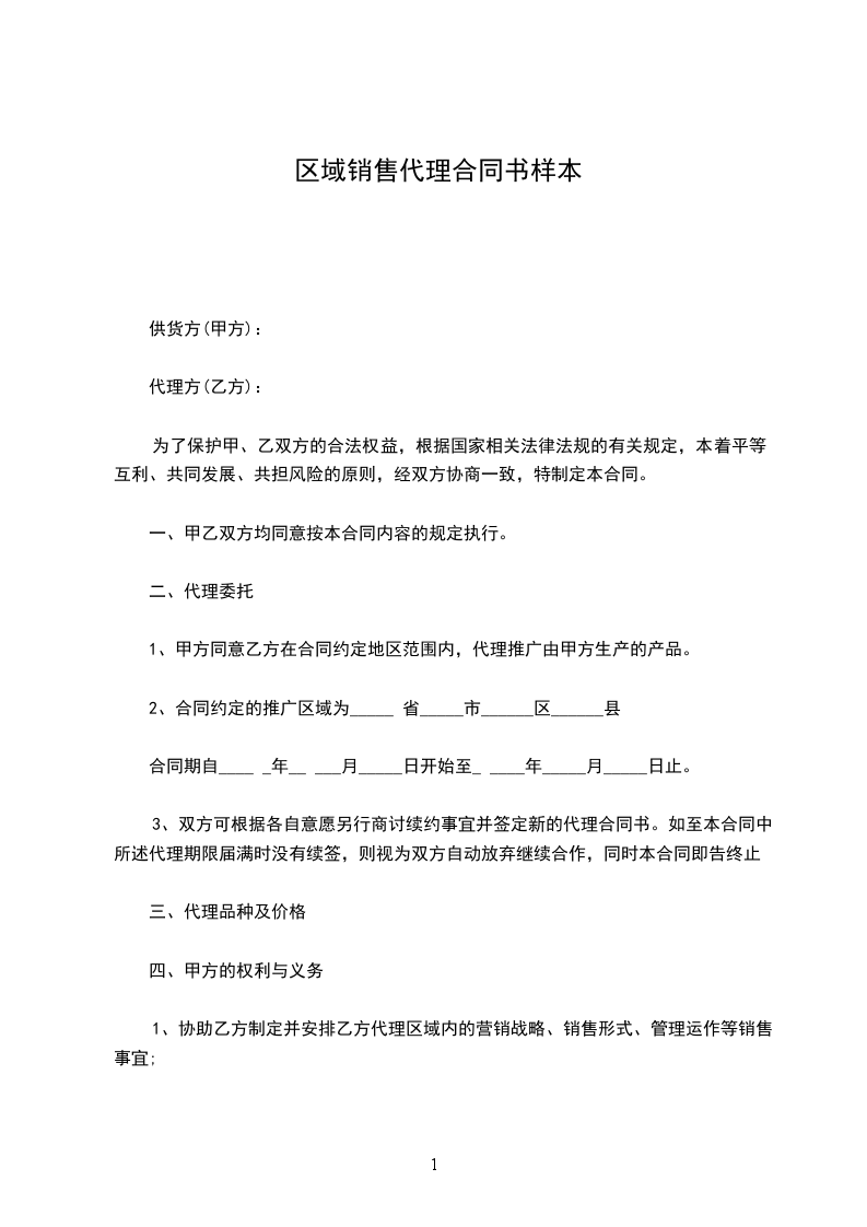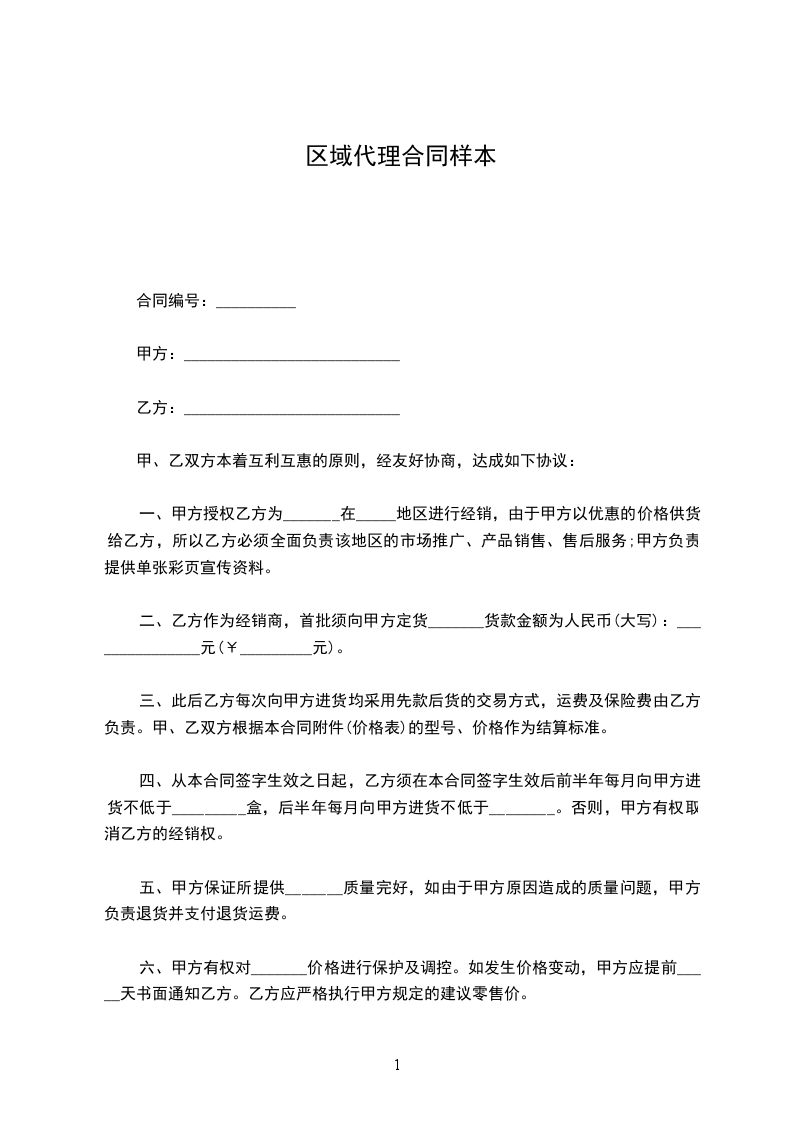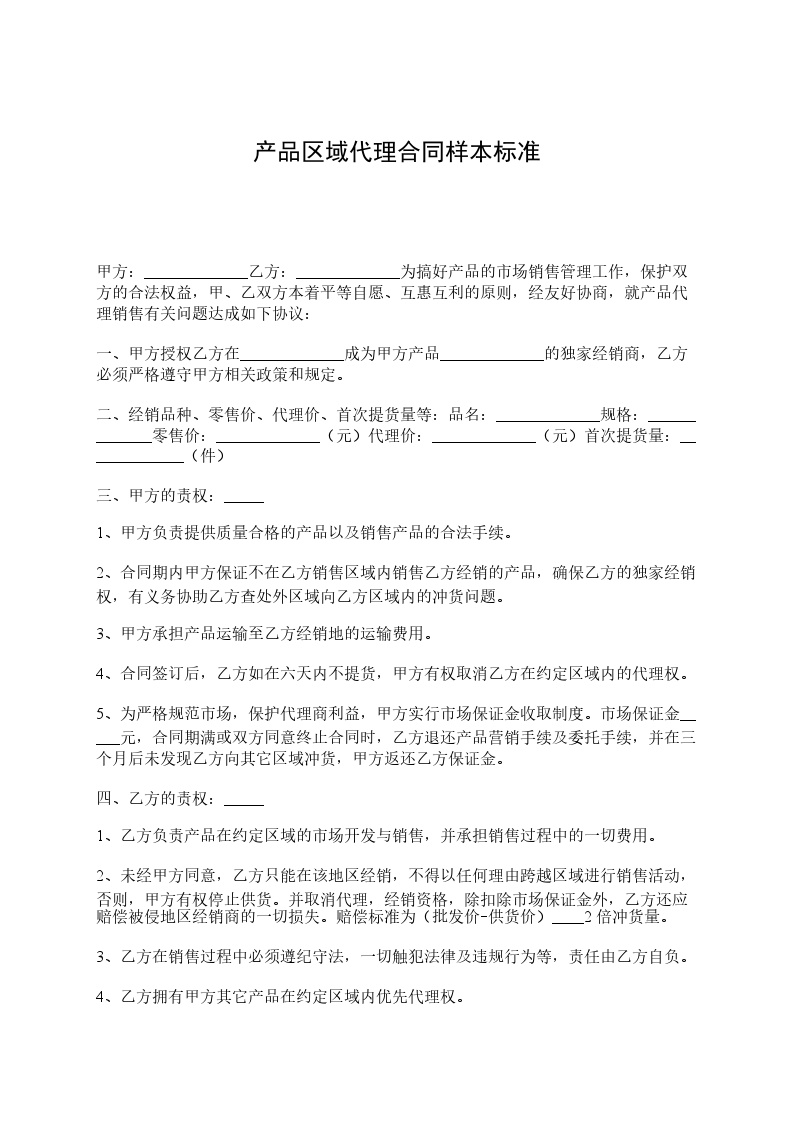 一、甲方授权乙方为_______在_____地区进行经销,由于甲方以优惠的价格供货给乙方,所以乙方必须全面负责该地区的市场推广、产品销售、售后服务;甲方负责提供单张彩页宣传资料。