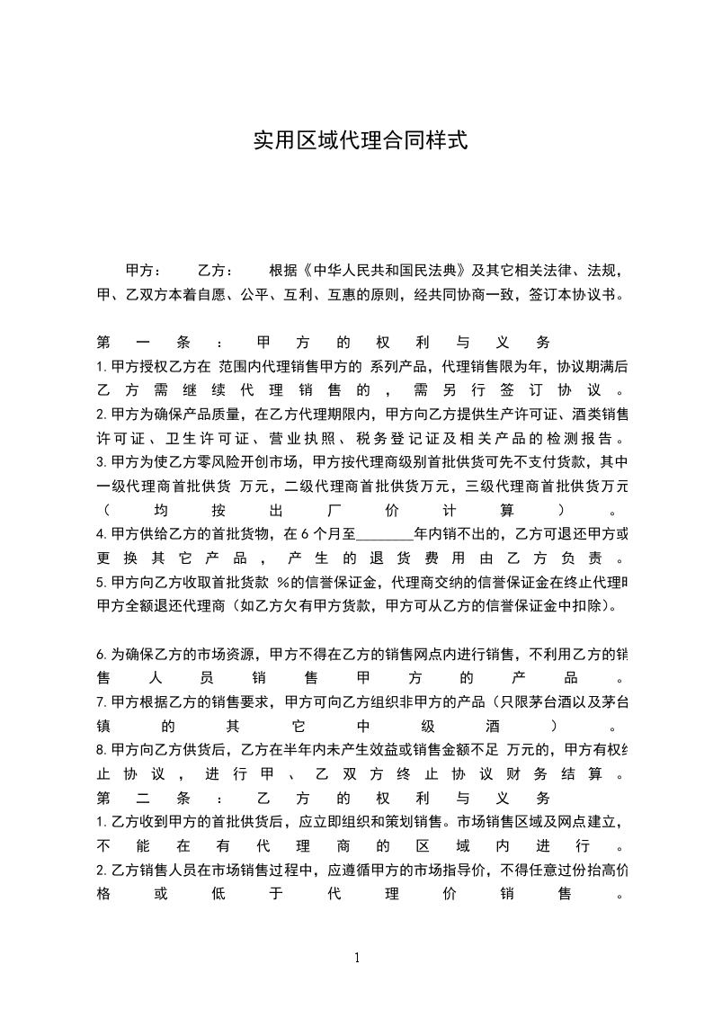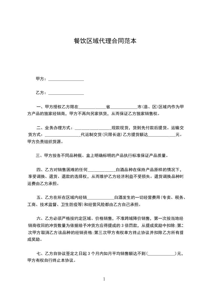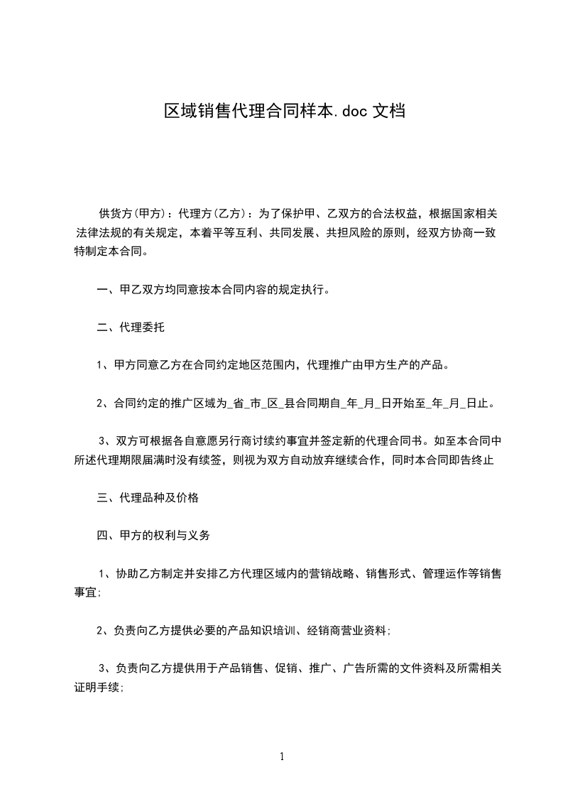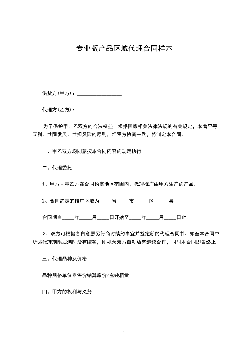 一、甲方授权乙方为_______在_____地区进行经销,由于甲方以优惠的价格供货给乙方,所以乙方必须全面负责该地区的市场推广、产品销售、售后服务;甲方负责提供单张彩页宣传资料。