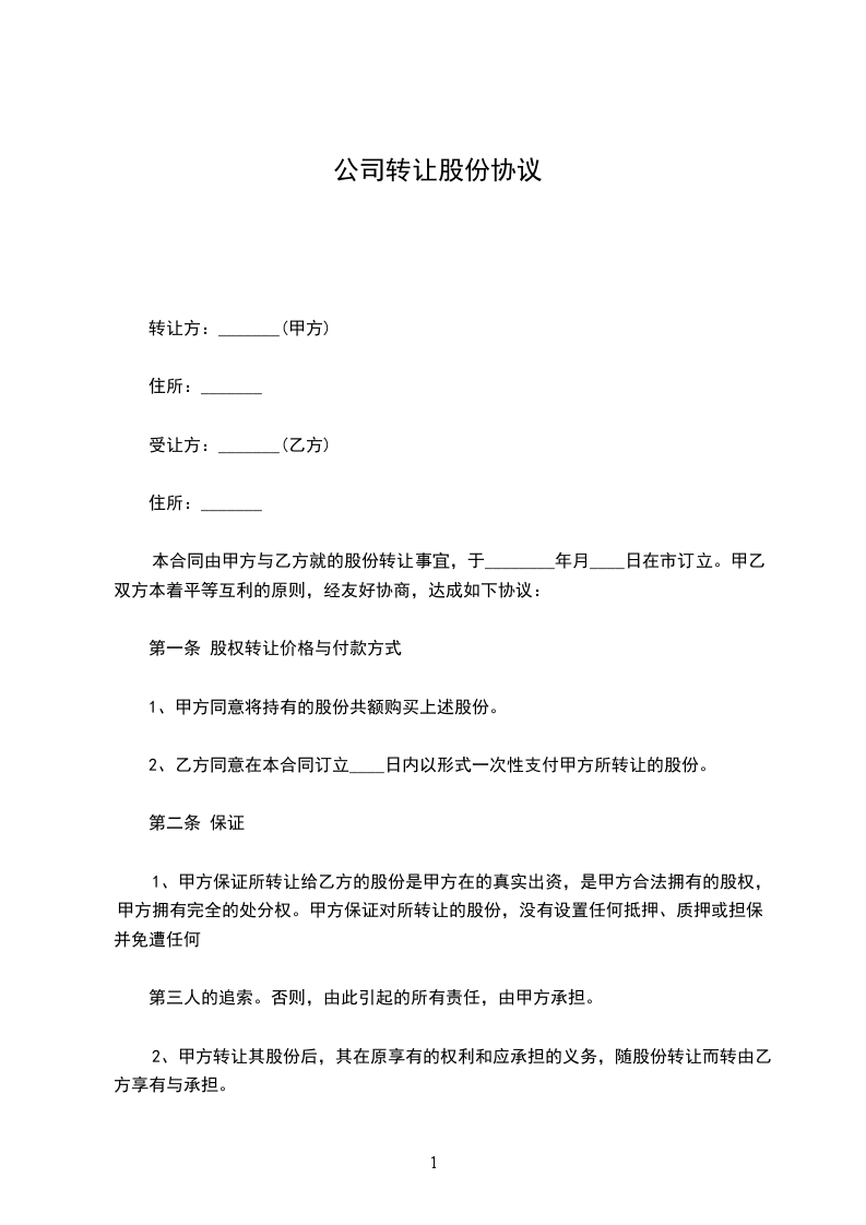 本合同由甲方与乙方就的股份转让事宜,于________年月____日在市订立。甲乙双方本着平等互利的原则,经友好协商,达成如下协议: