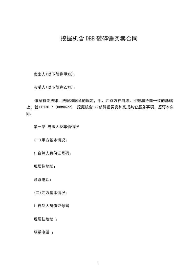 依据有关法律、法规和规章的规定,甲、乙双方在自愿、平等和协商一致的基础上,就PC130-7 (DBM0622) 挖掘机含BB破碎锤买卖和完成其它服务事项,签订本合同。