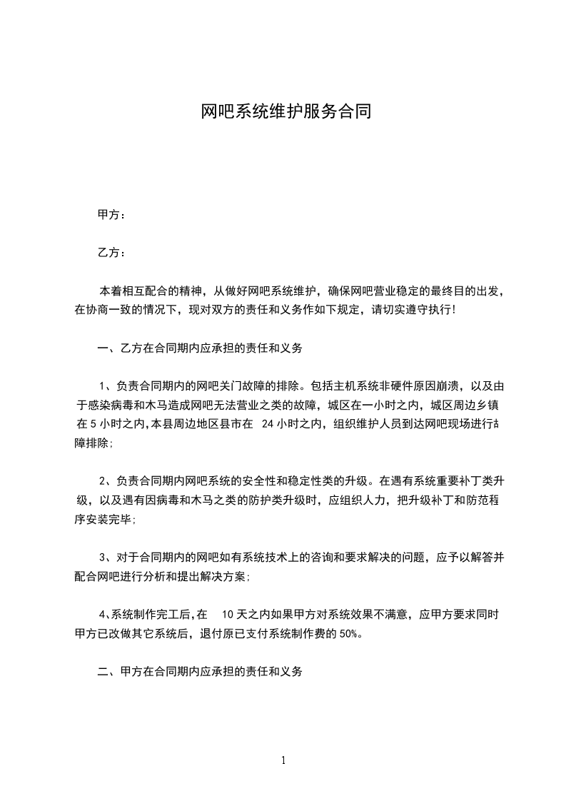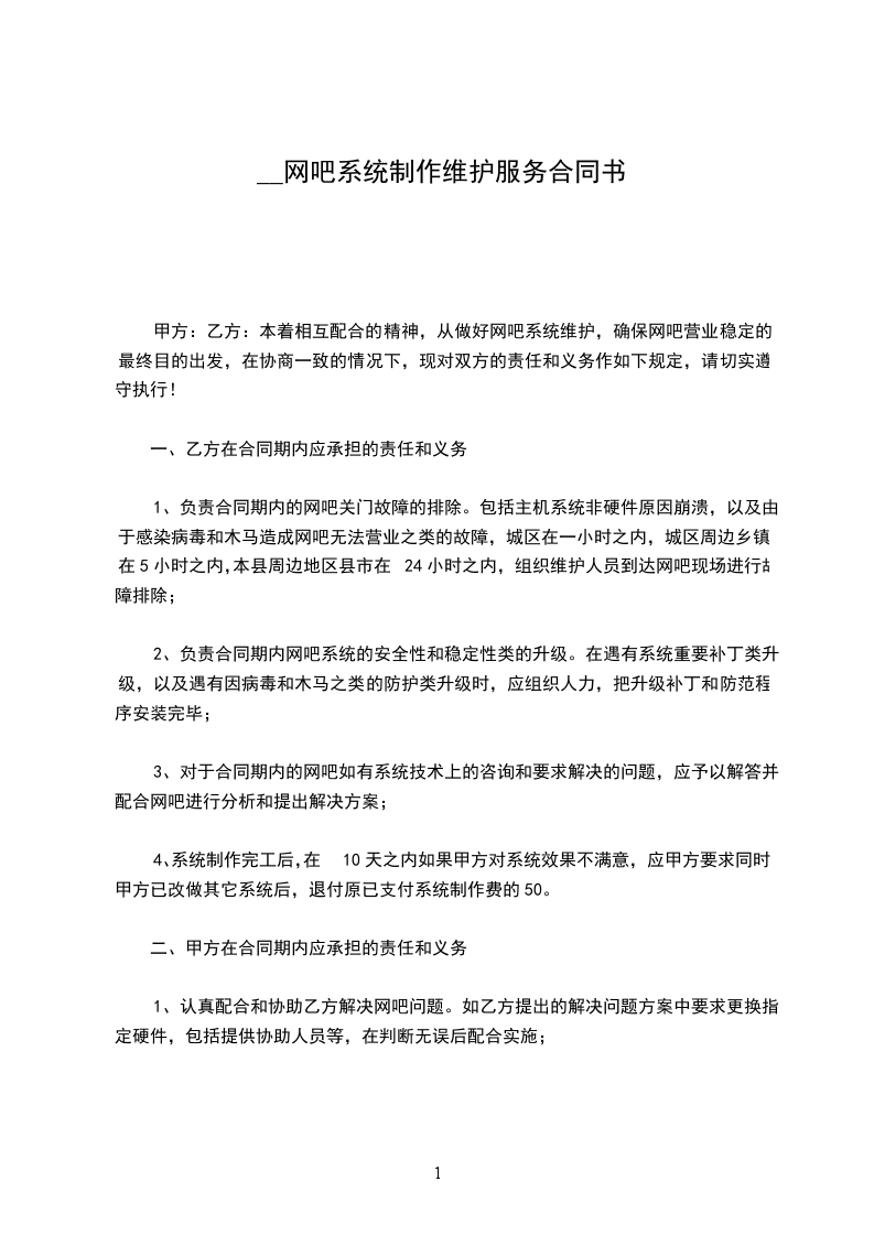 本着相互配合的精神,从做好网吧系统维护,确保网吧营业稳定的最终目的出发,在协商一致的情况下,现对双方的责任和义务作如下规定,请切实遵守执行!