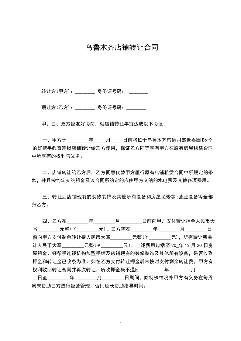一、甲方于_________年_____月_____日前将位于乌鲁木齐汽运司盛世嘉园B6-9的好帮手教育连锁店铺转让给乙方使用,保证乙方同等享有甲方在原有房屋租赁合同中所享有的权利与义务。