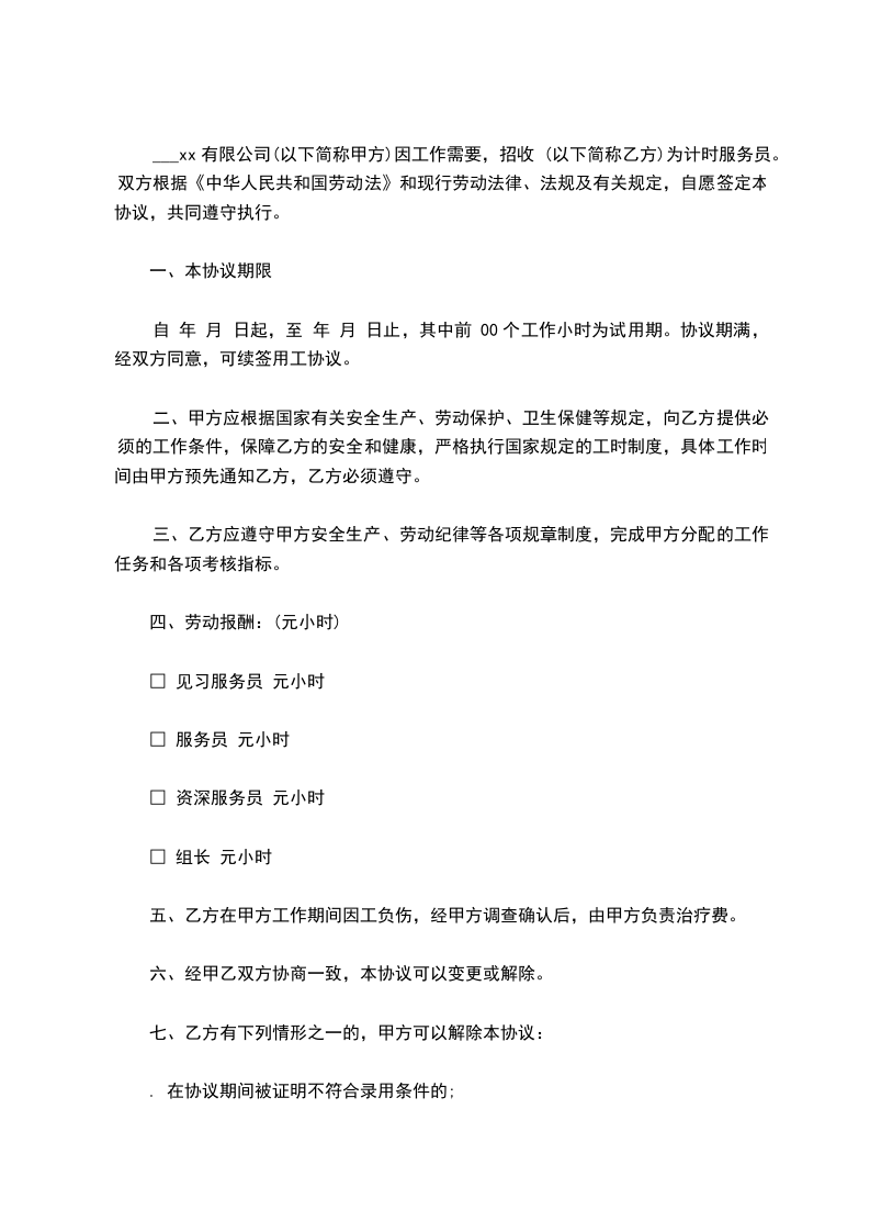 ___xx有限公司(以下简称甲方)因工作需要,招收 (以下简称乙方)为计时服务员。双方根据《中华人民共和国劳动法》和现行劳动法律、法规及有关规定,自愿签定本协议,共同遵守执行。