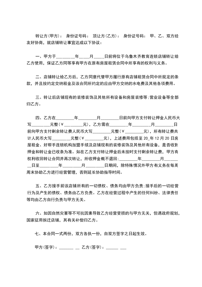 转让方(甲方): 身份证号码: 顶让方(乙方): 身份证号码: 甲、乙、双方经友好协商,就店铺转让事宜达成以下协议: