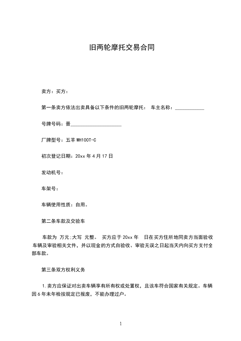 第一条卖方依法出卖具备以下条件的旧两轮摩托: 车主名称:____________