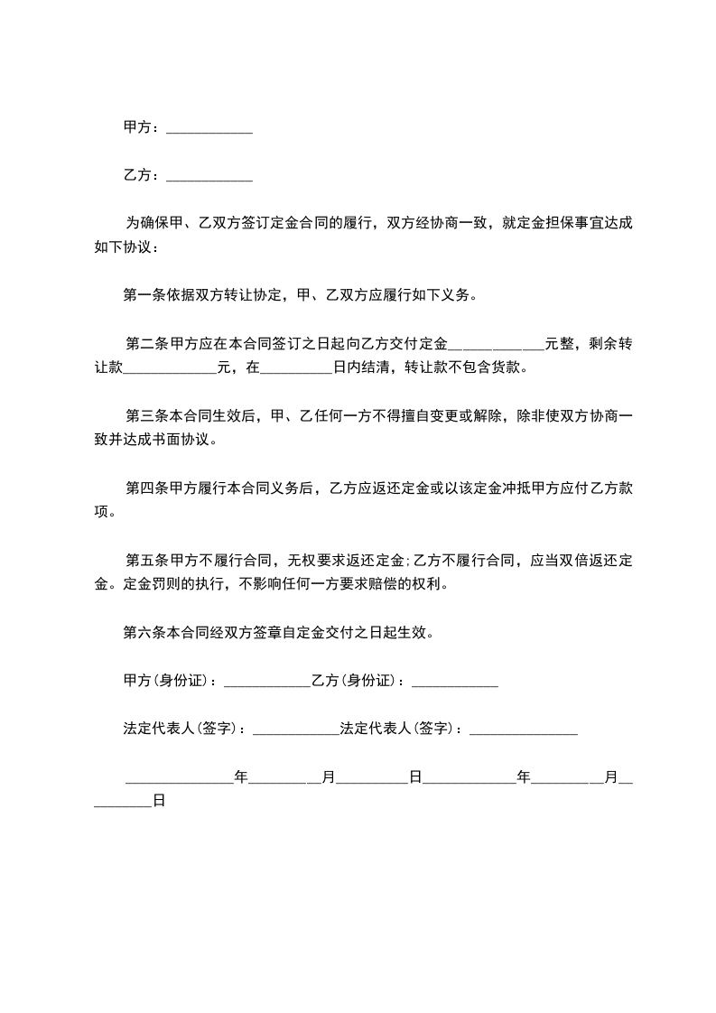 第三条 乙方同意签订本合同时,向甲方支付___________万元的定金,作为甲、乙双方当事人订立该房屋买卖合同的担保,签订房屋买卖合同后,乙方支付的定金转为房价款。甲方在收取定金后,应当向乙方开具收款凭证,并注明收款时间。乙方逾期未支付认购定金的,甲方有权解除本认购书,并有权将该商品房另行出卖给第三方。