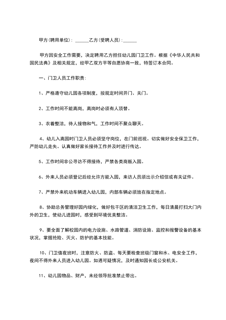 甲方因安全工作需要,决定聘用乙方担任庄上幼儿园门卫工作。根据《中华人民共和国民法典》及相关规定,经甲乙双方平等自愿协商一致,特签订本合同。
