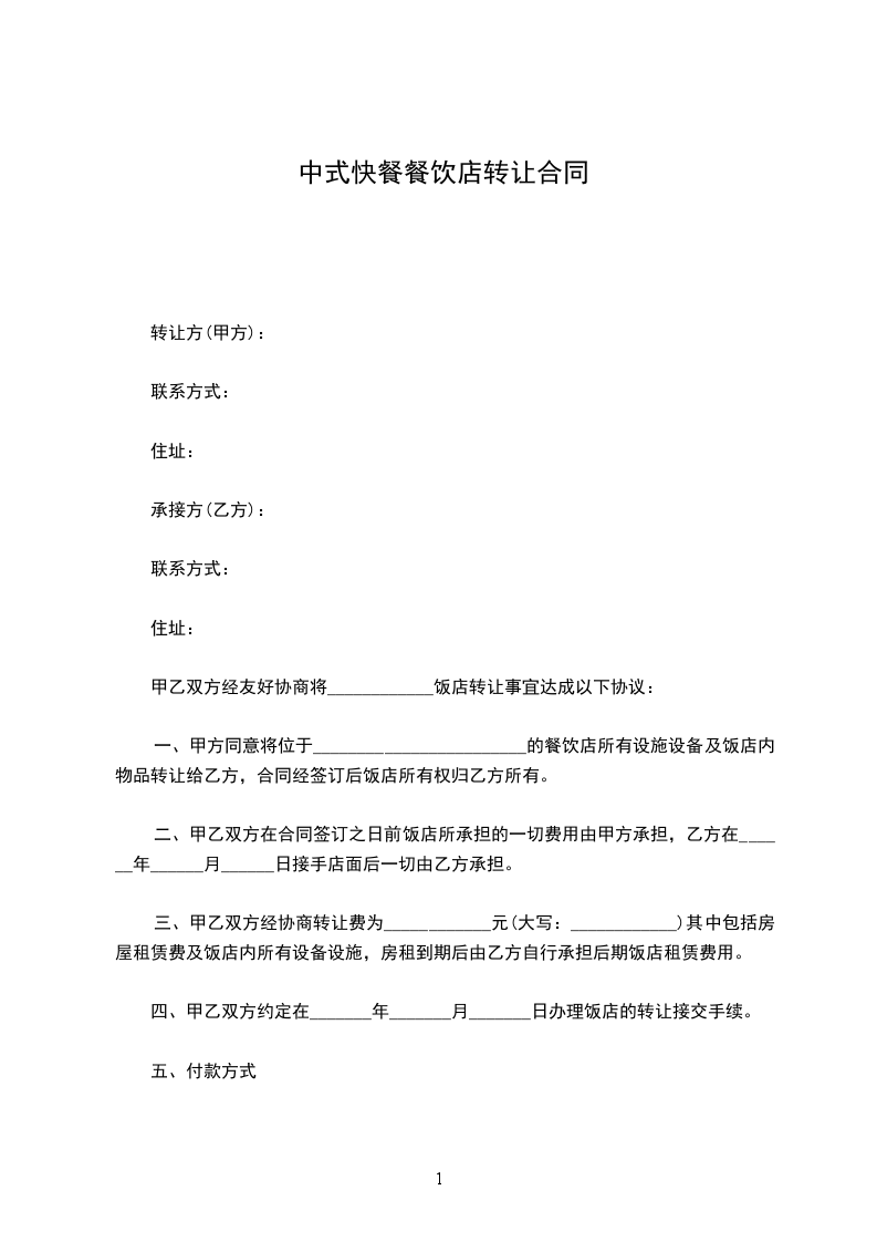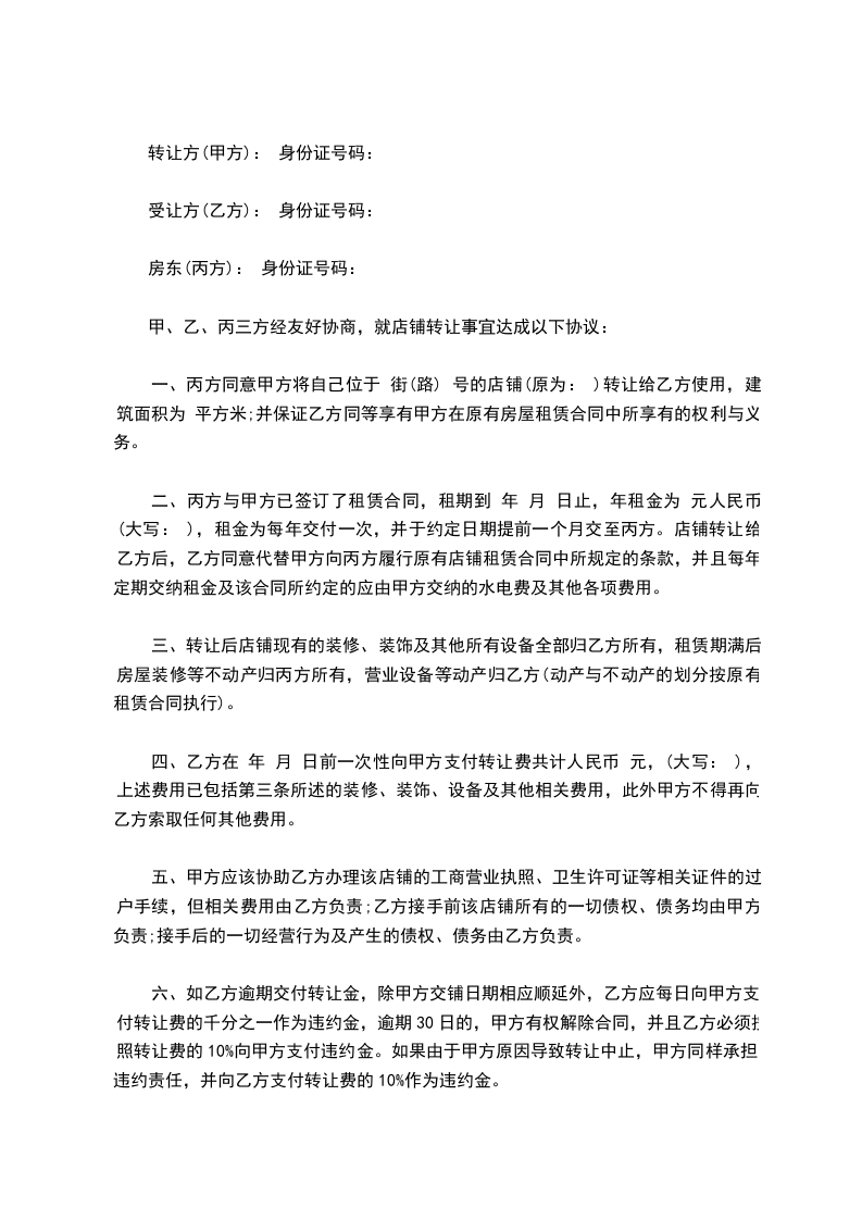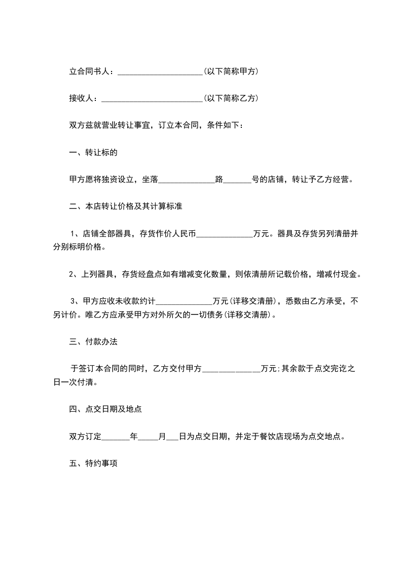 1、乙方在_______年_______月_______日预付转让费_______元(大写:______________),待甲方办理完所有手续后_______个工作日内将剩余款_________元(大写:______________)交付甲方。