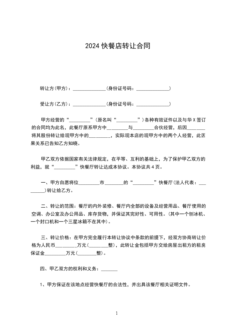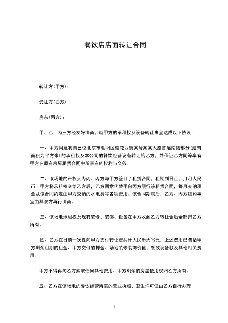 三、甲乙双方经协商转让费为____________元(大写:____________)其中包括房屋租赁费及饭店内所有设备设施,房租到期后由乙方自行承担后期饭店租赁费用。