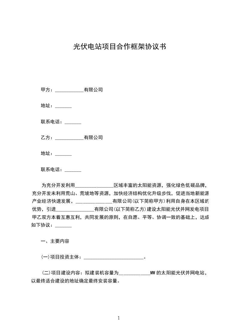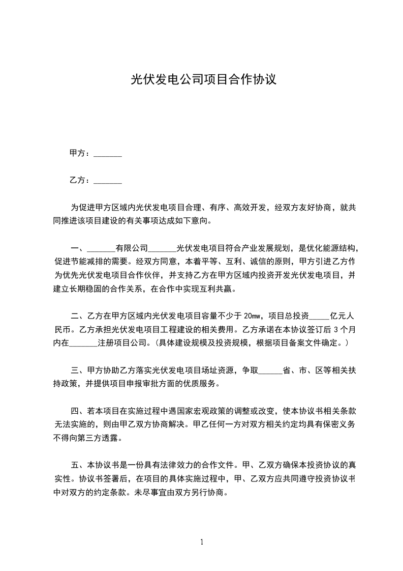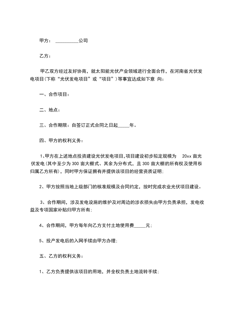 1、甲方在上述地点投资建设光伏发电项目,项目建设初步拟定规模为20xx亩光伏发电(其中至少为300亩大棚式、其余为分布式,且300亩大棚的所有权及使用权归属乙方所有),同时甲方保证拥有并提供该项目的经营资质证明;
