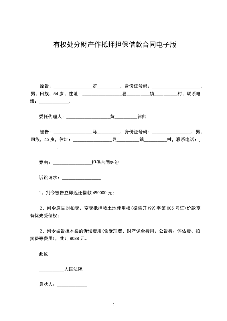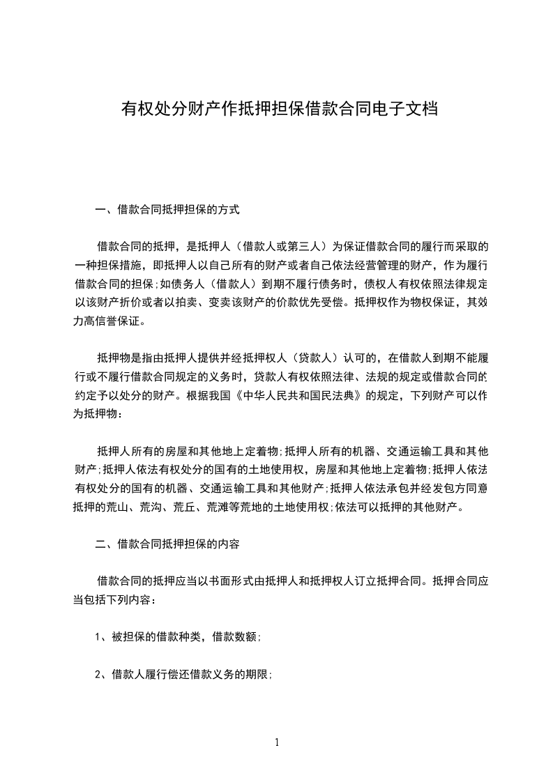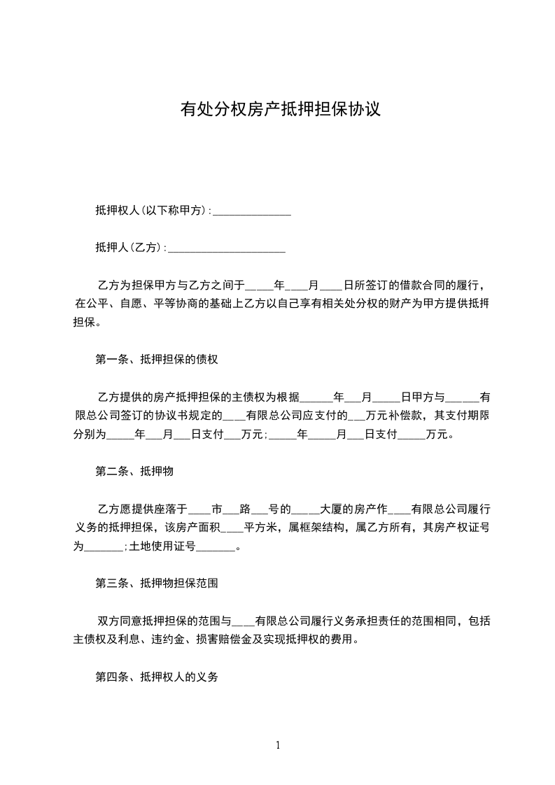 乙方为担保甲方与乙方之间于_____年____月____日所签订的借款合同的履行,在公平、自愿、平等协商的基础上乙方以自己享有相关处分权的财产为甲方提供抵押担保。
