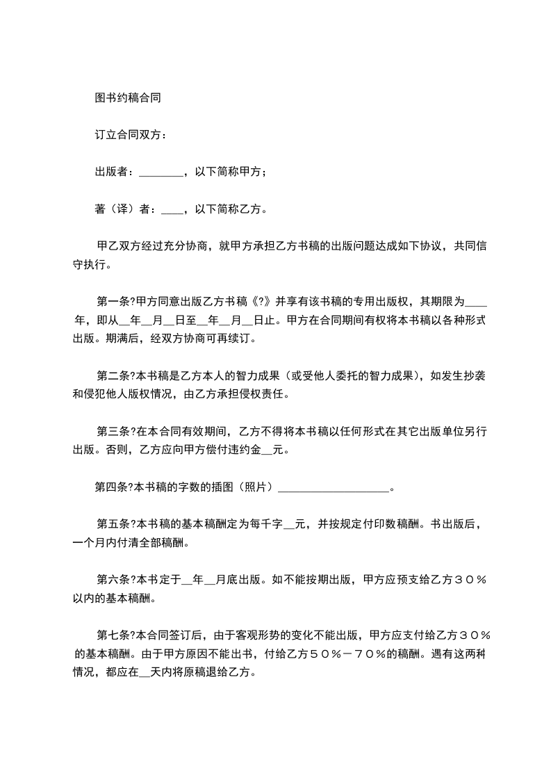 第七条本合同签订后,由于客观形势的变化不能出版,甲方应支付给乙方30%的基本稿酬。由于甲方原因不能出书,付给乙方50%-70%的稿酬。遇有这两种情况,都应在_天内将原稿退给乙方。