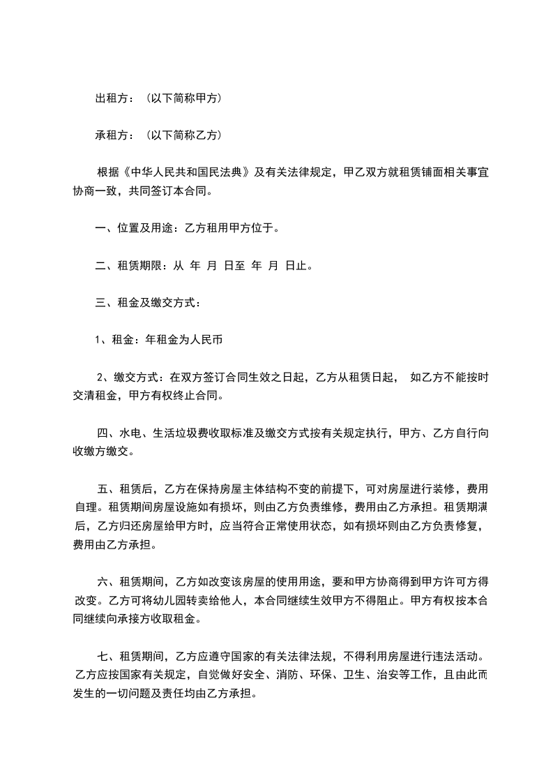 根据《中华人民共和国民法典》及有关法律规定,甲乙双方就租赁铺面相关事宜协商一致,共同签订本合同。