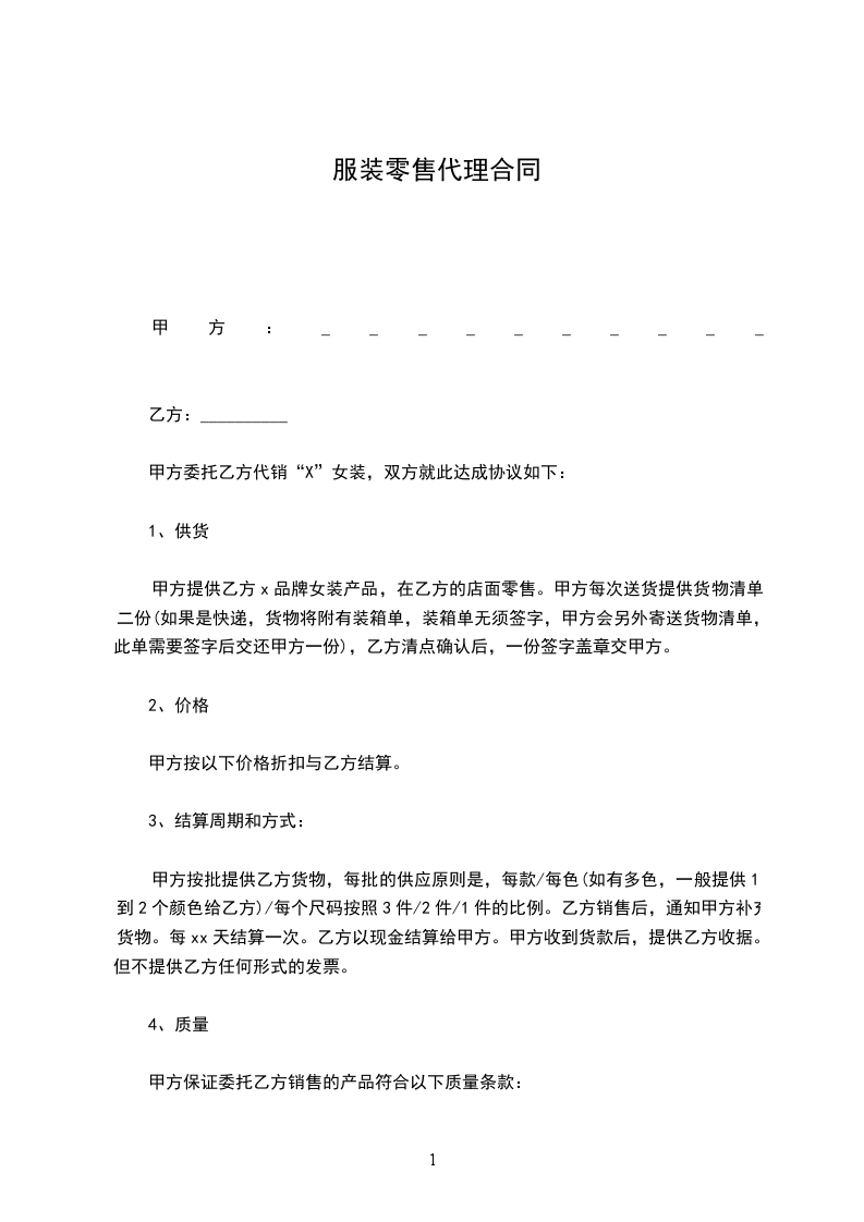 甲方提供乙方x品牌女装产品,在乙方的店面零售。甲方每次送货提供货物清单二份(如果是快递,货物将附有装箱单,装箱单无须签字,甲方会另外寄送货物清单,此单需要签字后交还甲方一份),乙方清点确认后,一份签字盖章交甲方。