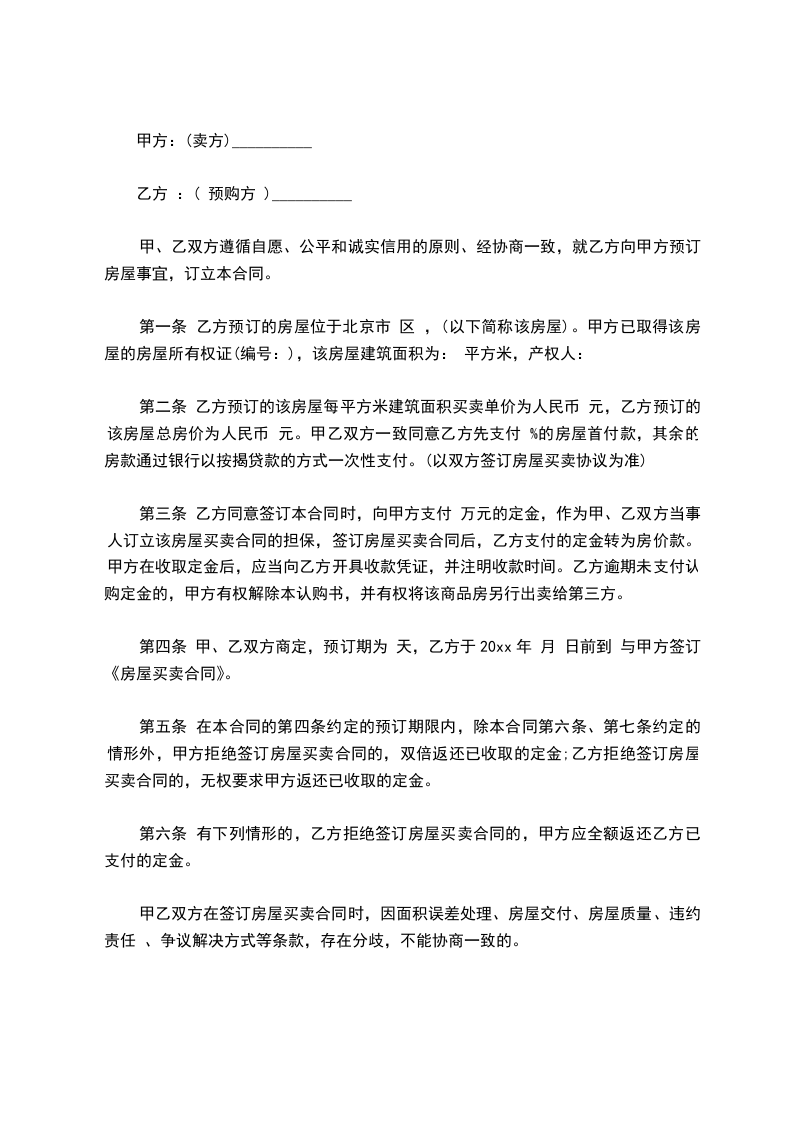 第四条 甲、乙双方商定,预订期为 天,乙方于20xx年 月 日前到 与甲方签订《房屋买卖合同》。