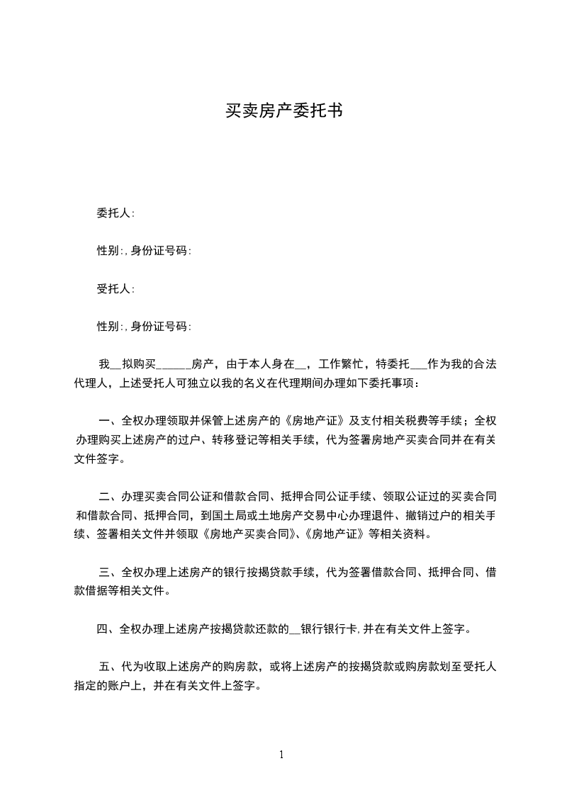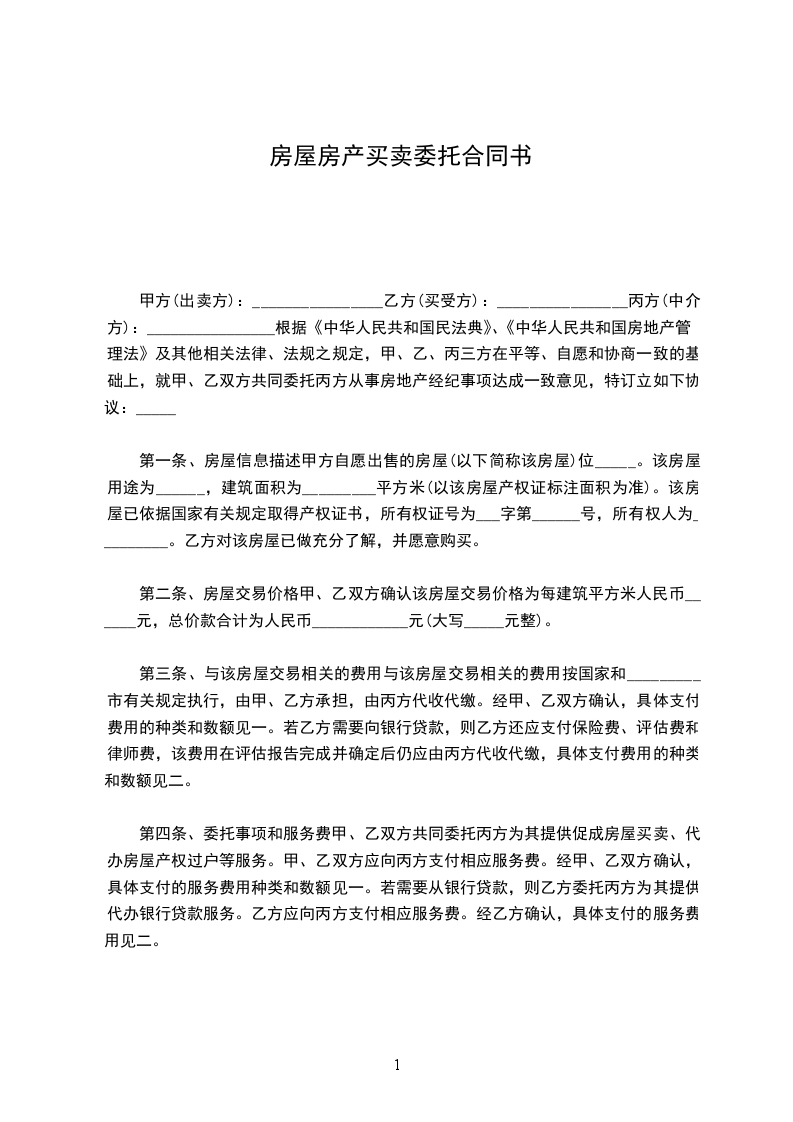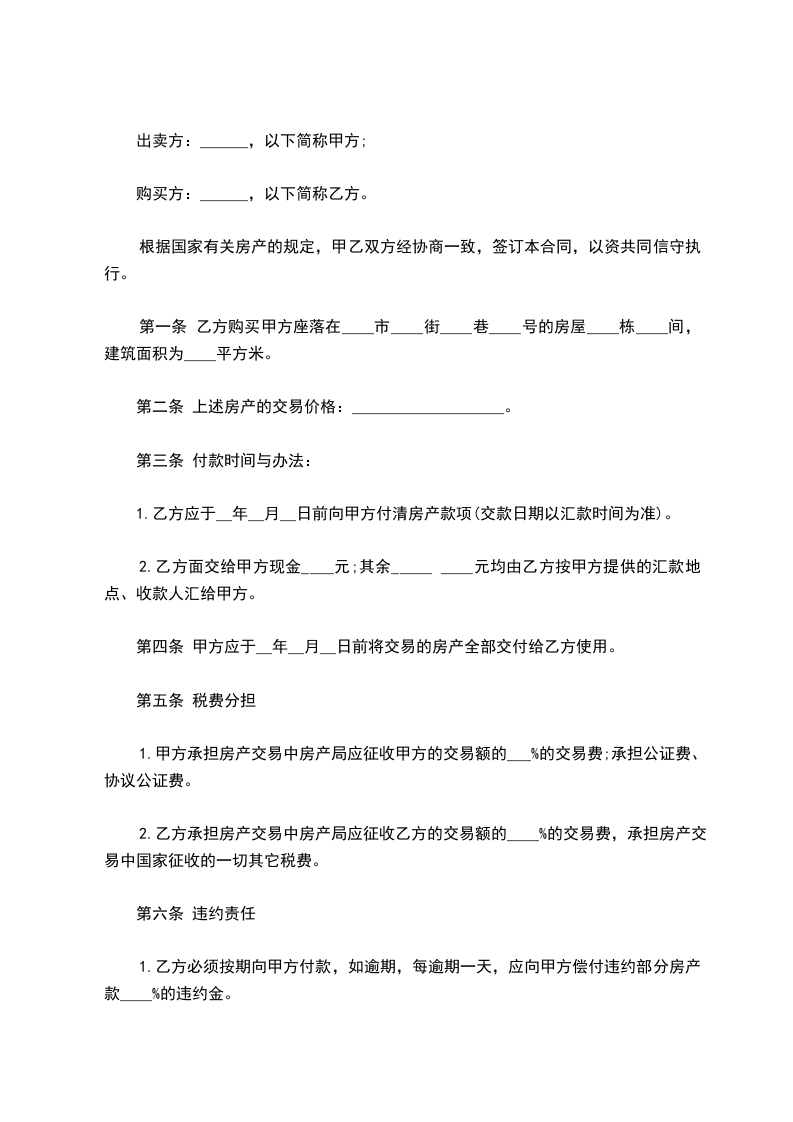 第一条 乙方购买甲方座落在____市____街____巷____号的房屋____栋____间,建筑面积为____平方米。