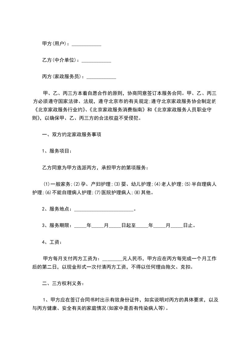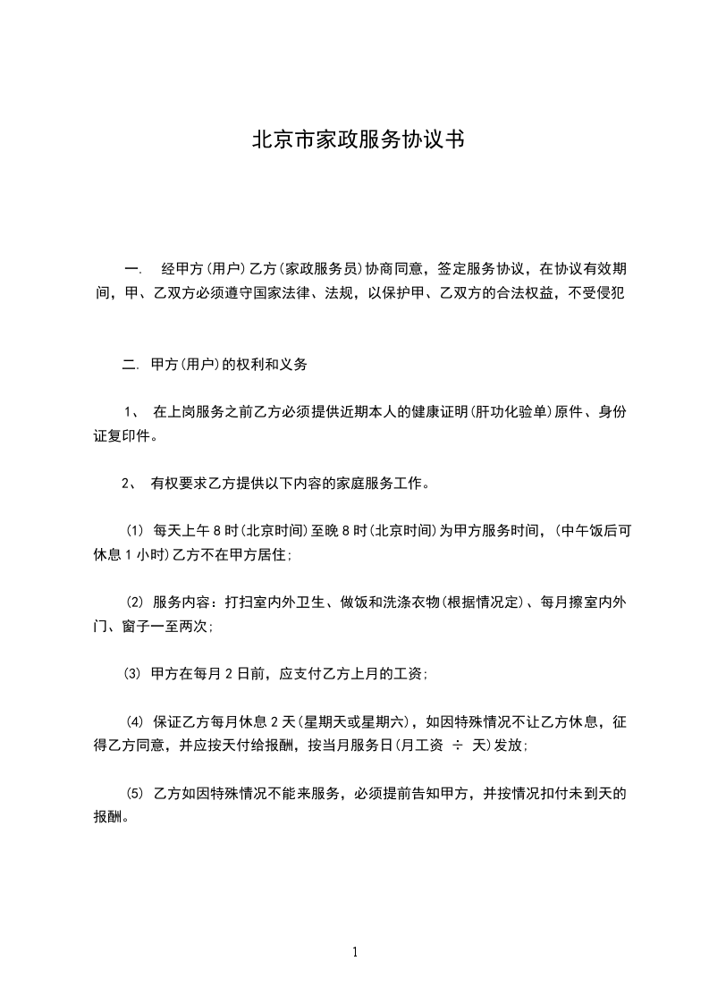 一. 经甲方(用户)乙方(家政服务员)协商同意,签定服务协议,在协议有效期间,甲、乙双方必须遵守国家法律、法规,以保护甲、乙双方的合法权益,不受侵犯。