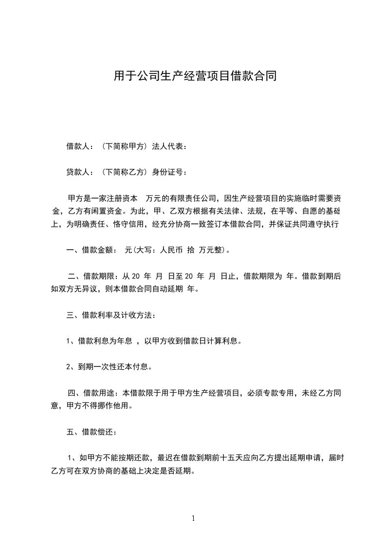 甲方是一家注册资本 万元的有限责任公司,因生产经营项目的实施临时需要资金,乙方有闲置资金。为此,甲、乙双方根据有关法律、法规,在平等、自愿的基础上,为明确责任、恪守信用,经充分协商一致签订本借款合同,并保证共同遵守执行。