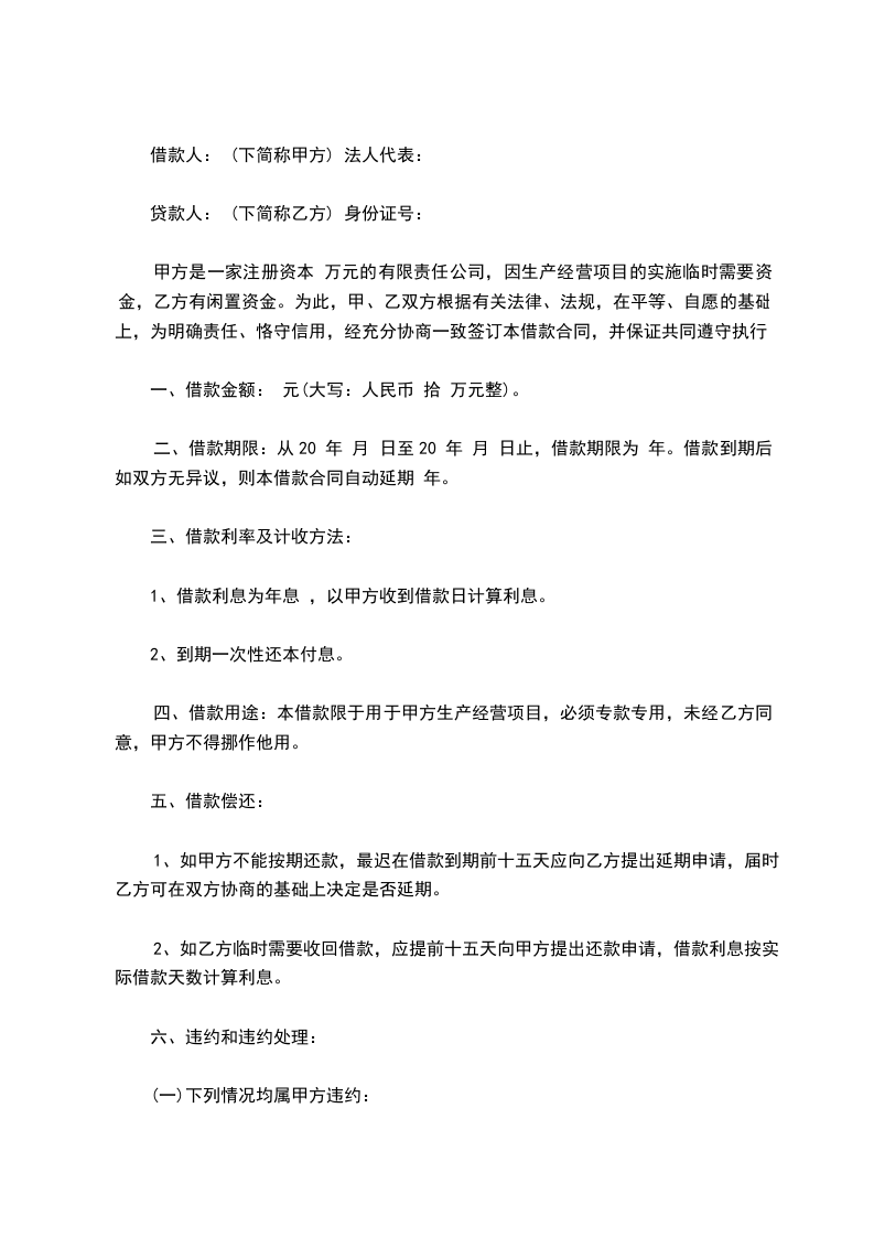 一、借款金额: 元(大写:人民币 拾 万元整)。