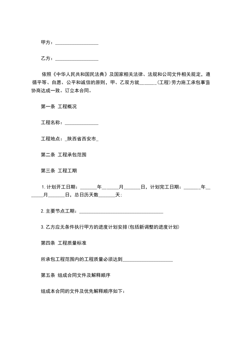 依照《中华人民共和国民法典》及国家相关法律、法规和公司文件相关规定,遵循平等、自愿、公平和诚信的原则,甲、乙双方就_______(工程)劳力施工承包事宜协商达成一致。订立本合同。