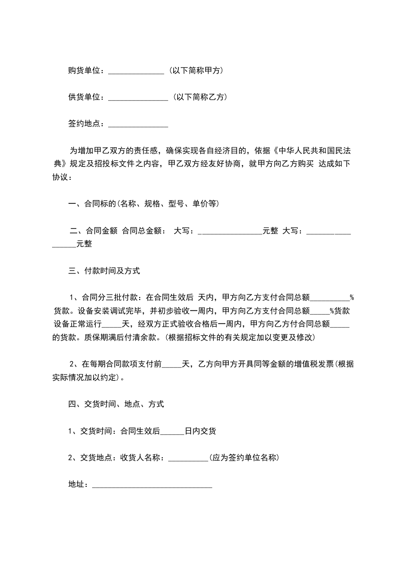 1、合同分三批付款:在合同生效后 天内,甲方向乙方支付合同总额__________%货款。设备安装调试完毕,并初步验收一周内,甲方向乙方支付合同总额_____%货款。设备正常运行_____天,经双方正式验收合格后一周内,甲方向乙方付合同总额_____%的货款。质保期满后付清余款。(根据招标文件的有关规定加以变更及修改)