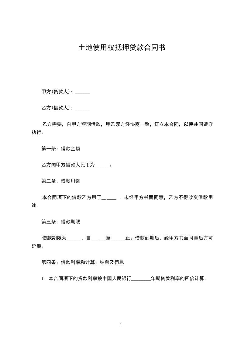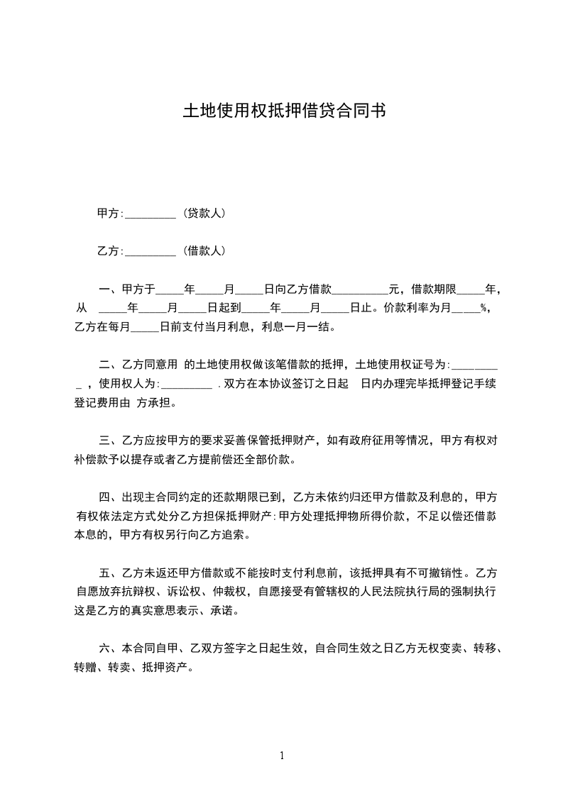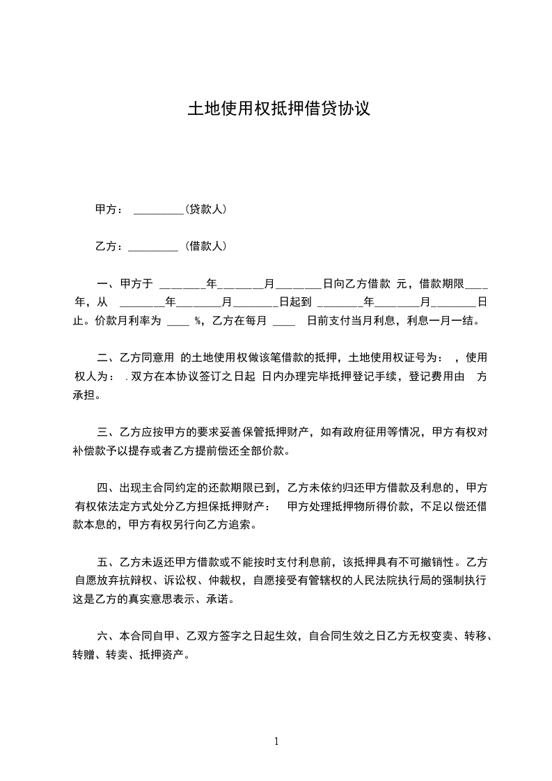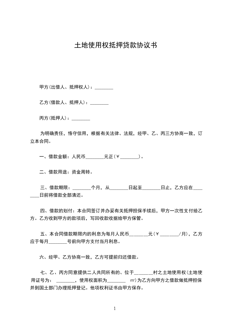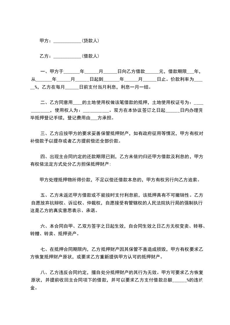 二、乙方同意用 的土地使用权做该笔借款的抵押,土地使用权证号为: ,使用权人为: 。双方在本协议签订之日起 日内办理完毕抵押登记手续,登记费用由 方承担。
