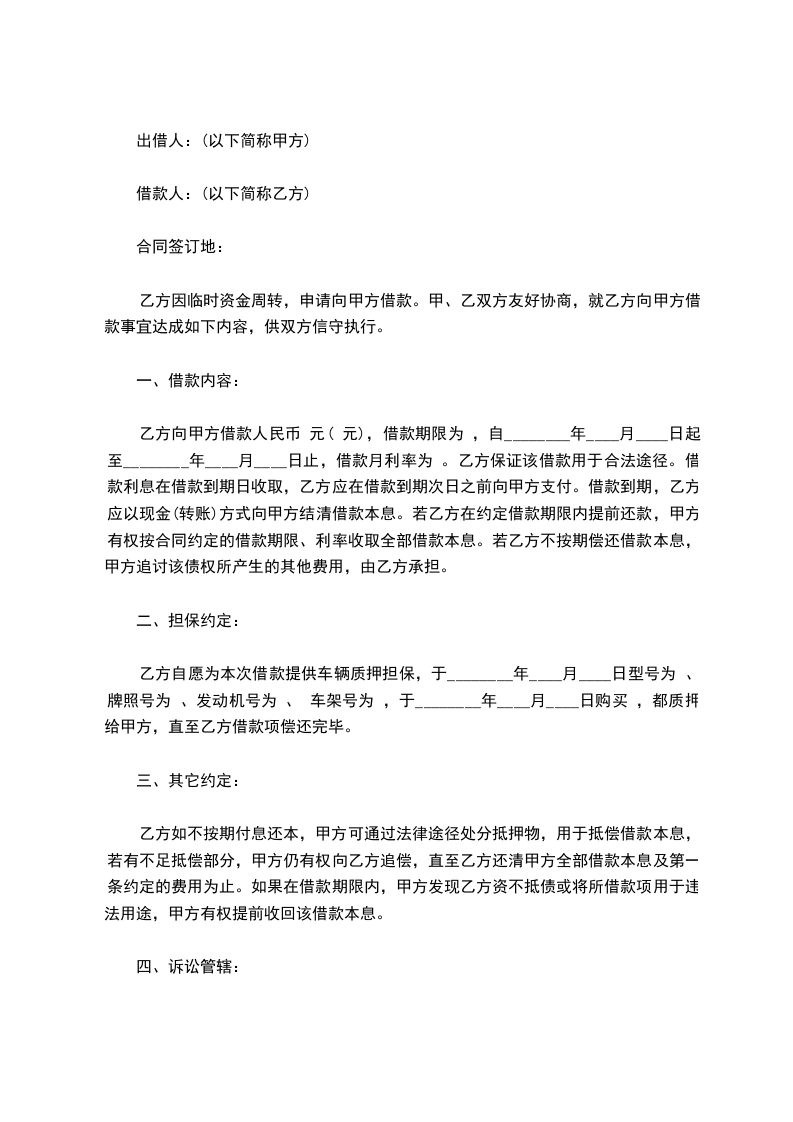 乙方自愿为本次借款提供车辆质押担保,于________年____月____日型号为 、牌照号为 、发动机号为 、 车架号为 ,于________年____月____日购买 ,都质押给甲方,直至乙方借款项偿还完毕。