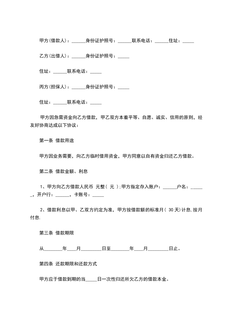 乙方向甲方借款人民币 元( 元),借款期限为 ,自________年____月____日起至________年____月____日止,借款月利率为 。乙方保证该借款用于合法途径。借款利息在借款到期日收取,乙方应在借款到期次日之前向甲方支付。借款到期,乙方应以现金(转账)方式向甲方结清借款本息。若乙方在约定借款期限内提前还款,甲方有权按合同约定的借款期限、利率收取全部借款本息。若乙方不按期偿还借款本息,甲方追讨该债权所产生的其他费用,由乙方承担。
