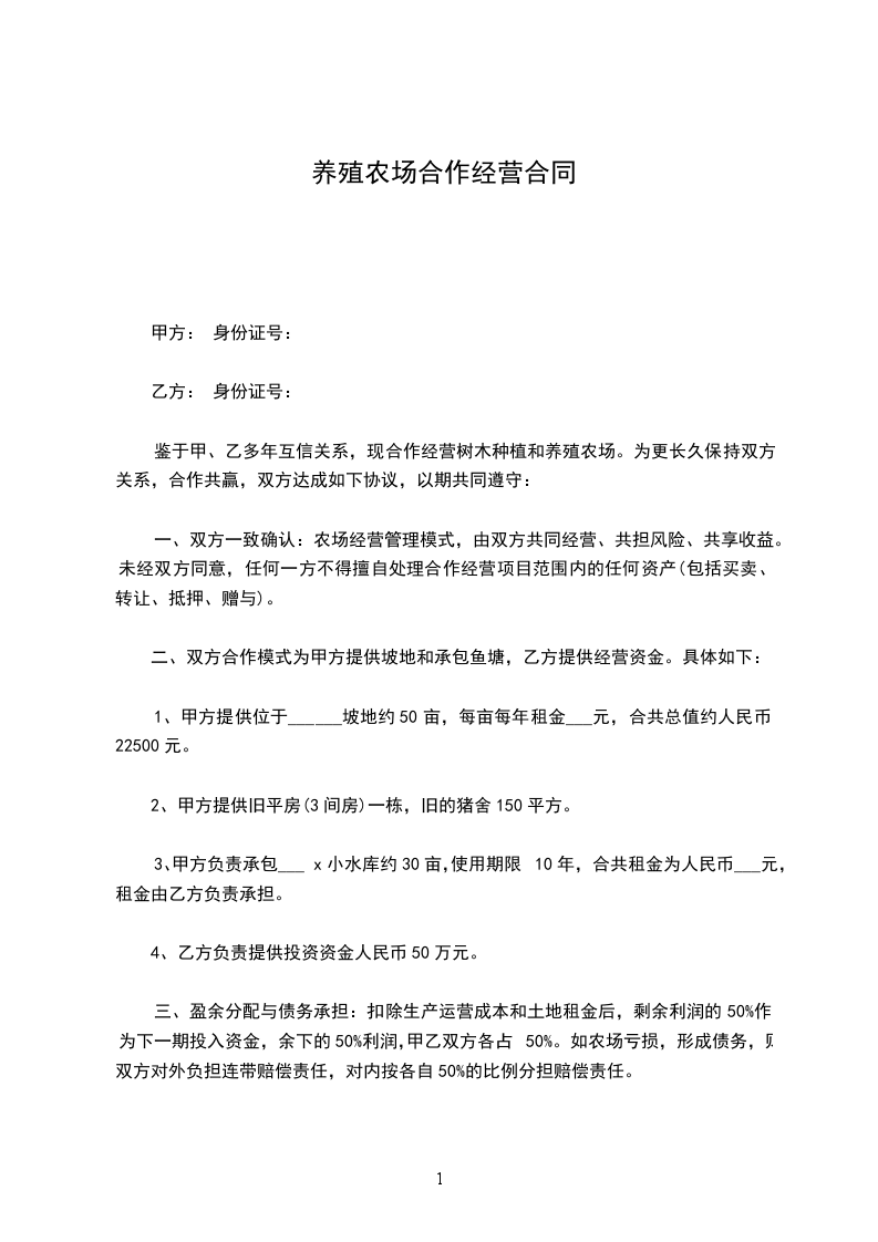 四、合作经营期间,如果政府或企业征用农场土地、鱼塘,所得的赔偿款双方各占50%。