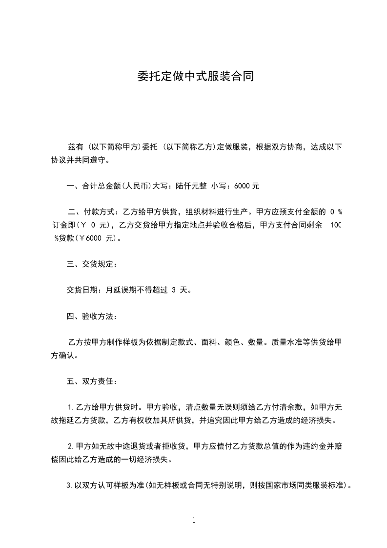 二、付款方式:乙方给甲方供货,组织材料进行生产。甲方应预支付全额的 0 %订金即(¥ 0 元),乙方交货给甲方指定地点并验收合格后,甲方支付合同剩余 100 %货款(¥6000 元)。