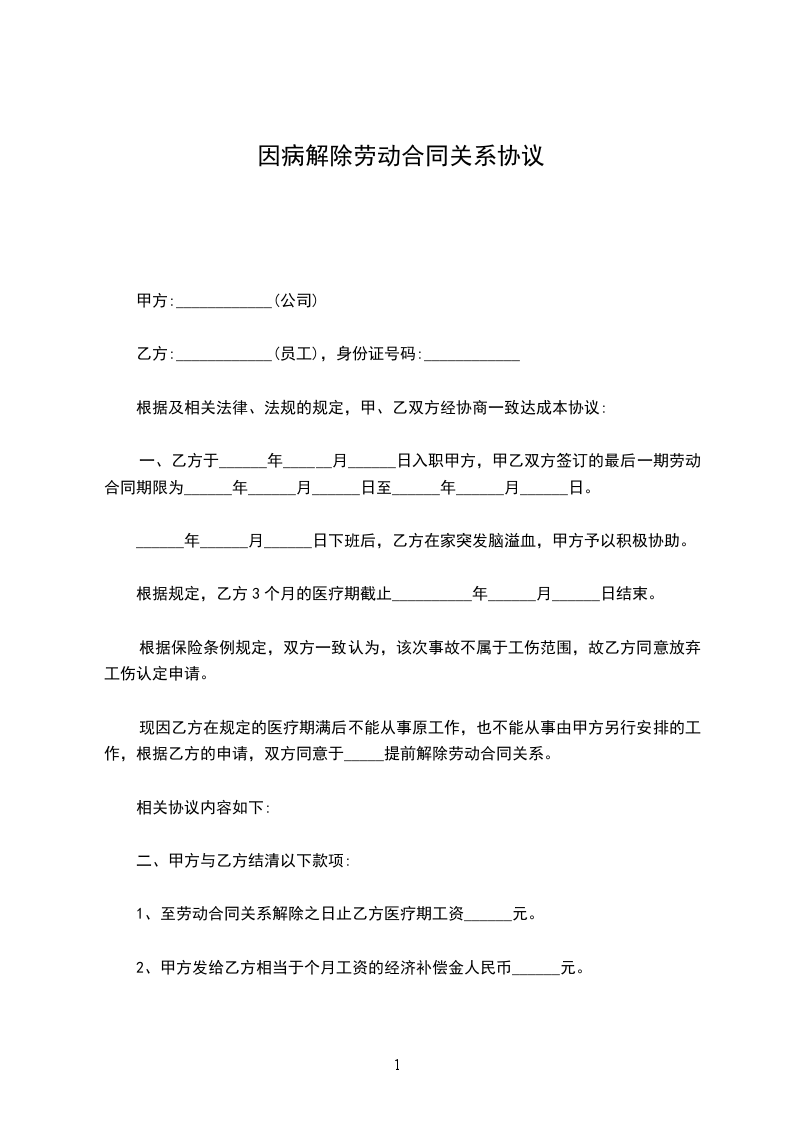 一、乙方于________年____月____日入职甲方,甲乙双方签订的最后一期劳动合同期限为________年____月____日至________年____月____日。20________年____月____日下班后,乙方在家突发脑溢血,甲方予以积极协助。根据规定,乙方3个月的医疗期截止________年____月日结束。