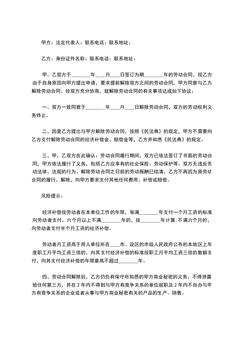 根据保险条例规定,双方一致认为,该次事故不属于工伤范围,故乙方同意放弃工伤认定申请。现因乙方在规定的医疗期满后不能从事原工作,也不能从事由甲方另行安排的工作,根据乙方的申请,双方同意于________年____月____日提前解除劳动合同关系。相关协议内容如下: