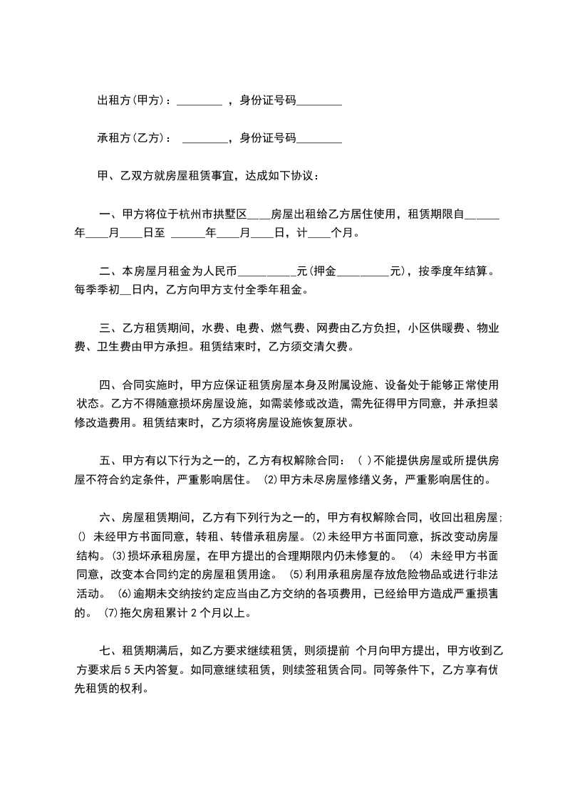 一、甲方将位于杭州市拱墅区____房屋出租给乙方居住使用,租赁期限自______年____月____日至 ______年____月____日,计____个月。