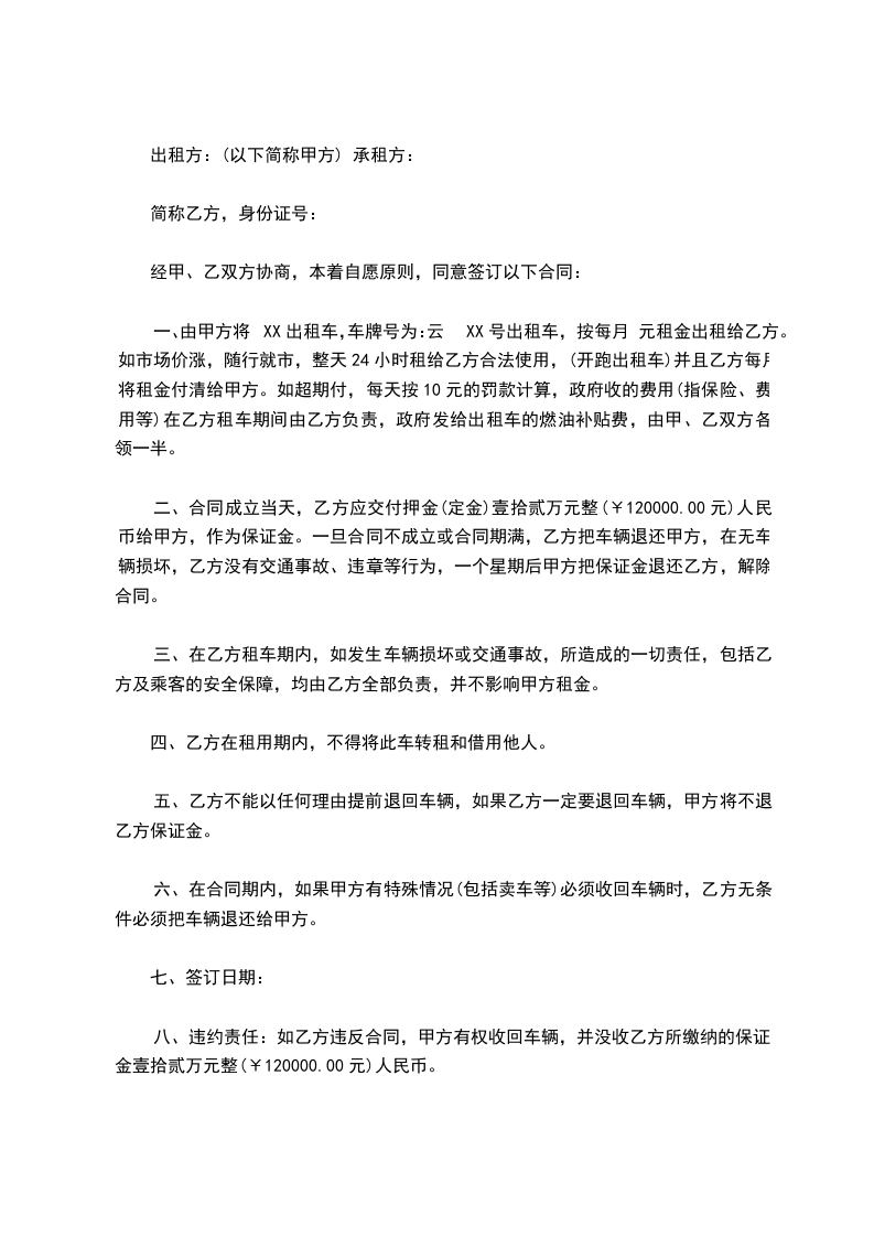 7、在本协议有效期内,乙方不得带实习驾驶员,不得将车转让其他人驾驶,如发现乙方有不爱惜车辆情况,甲方方有权收回该车辆,同时押金不予退还。