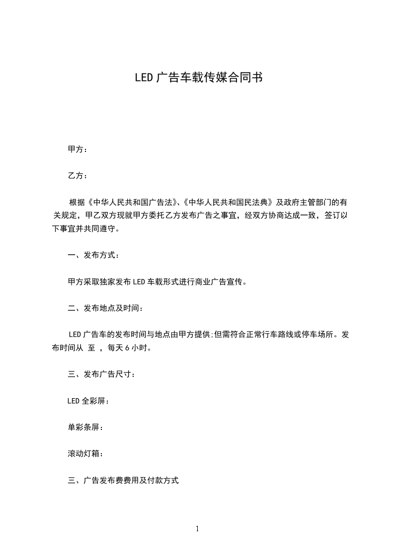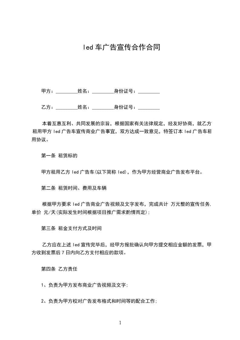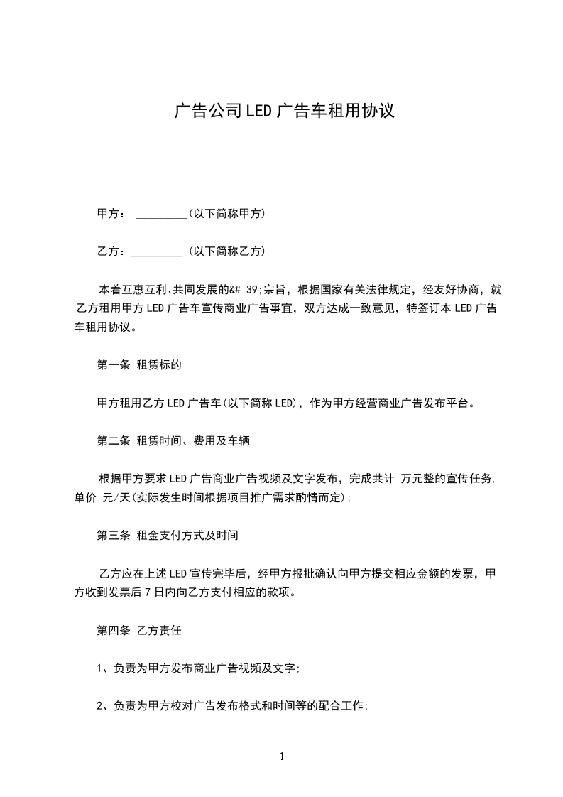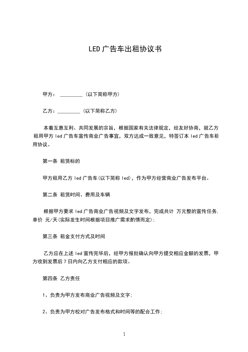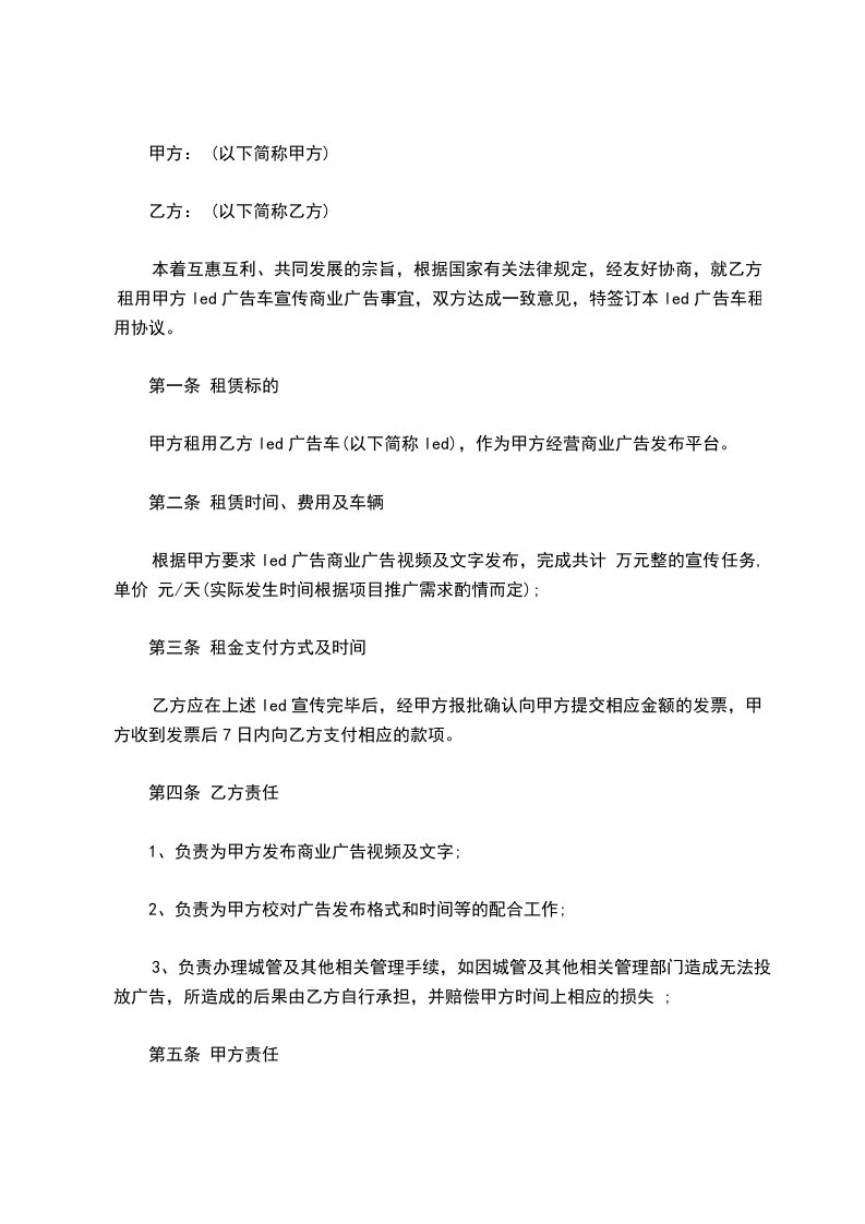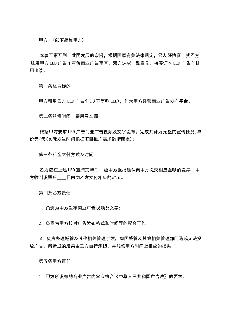 甲方租用乙方led广告车(以下简称led),作为甲方经营商业广告发布平台。
