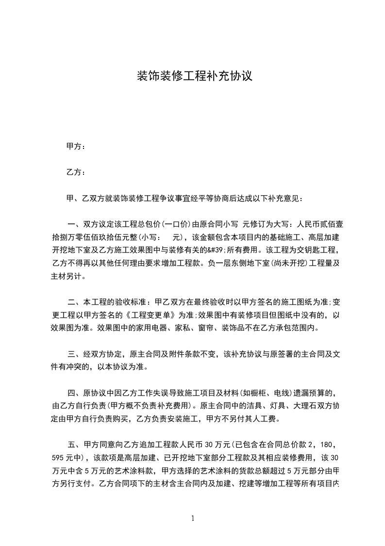 五、甲方同意向乙方追加工程款人民币30万元(已包含在合同总价款2,180,595元中),该款项是高层加建、已开挖地下室部分工程款及其相应装修费用,该30万元中含5万元的艺术涂料款,甲方选择的艺术涂料的货款总额超过5万元部分由甲方另行支付。乙方合同项下的主材含主合同内及加建、挖建等增加工程等所有项目内的楼梯扶手、房间实木复合门、铁艺门、马赛克、木地板、中式橱柜、西式橱柜、衣柜等。