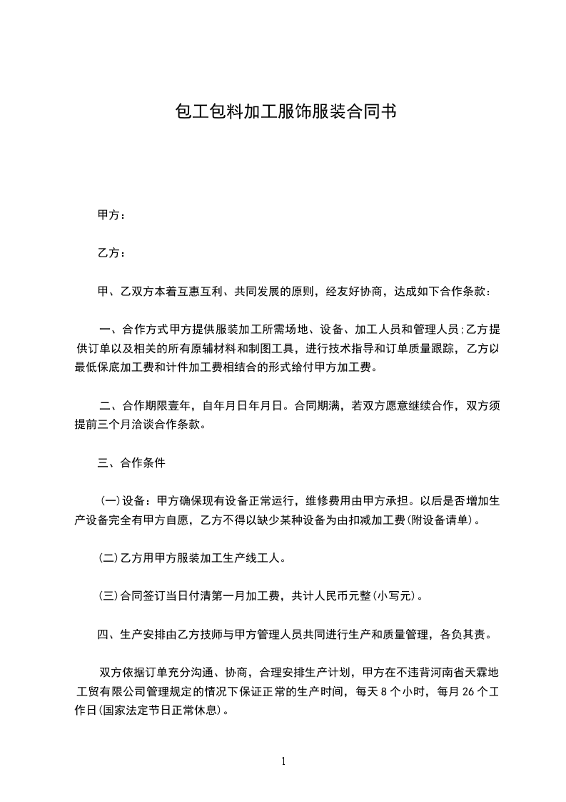 一、合作方式甲方提供服装加工所需场地、设备、加工人员和管理人员;乙方提供订单以及相关的所有原辅材料和制图工具,进行技术指导和订单质量跟踪,乙方以最低保底加工费和计件加工费相结合的形式给付甲方加工费。