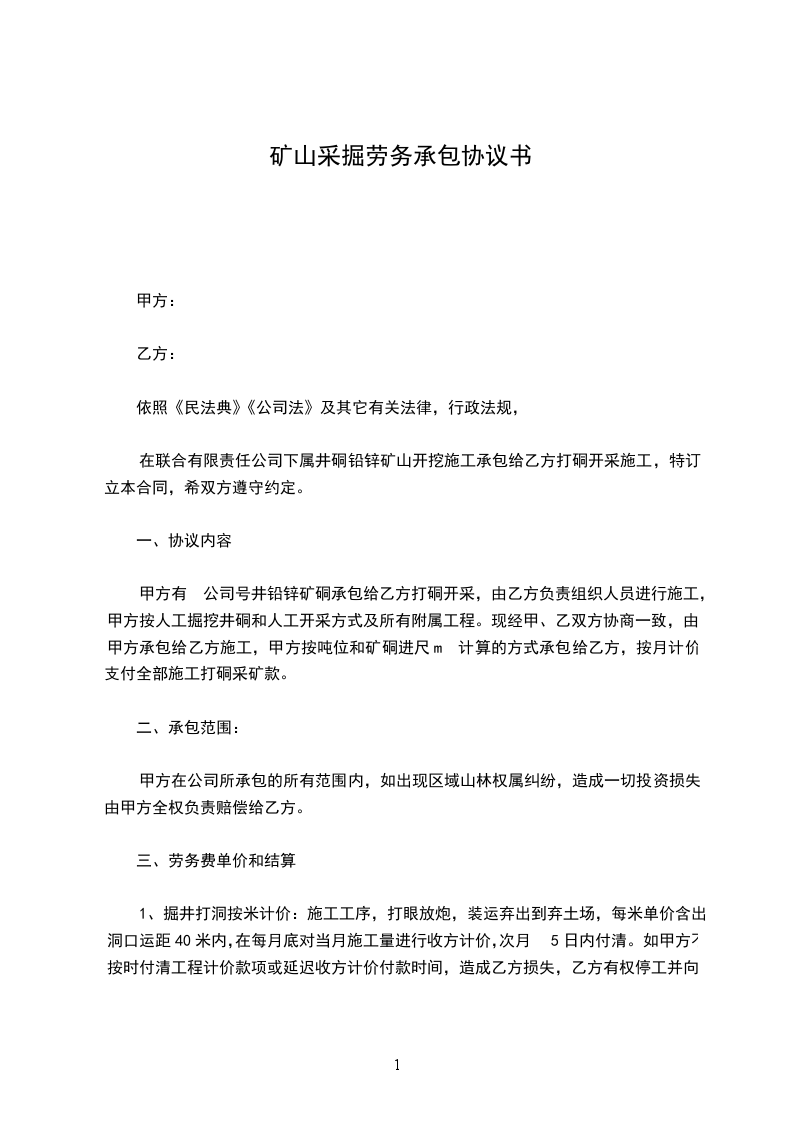 在联合有限责任公司下属井硐铅锌矿山开挖施工承包给乙方打硐开采施工,特订立本合同,希双方遵守约定。