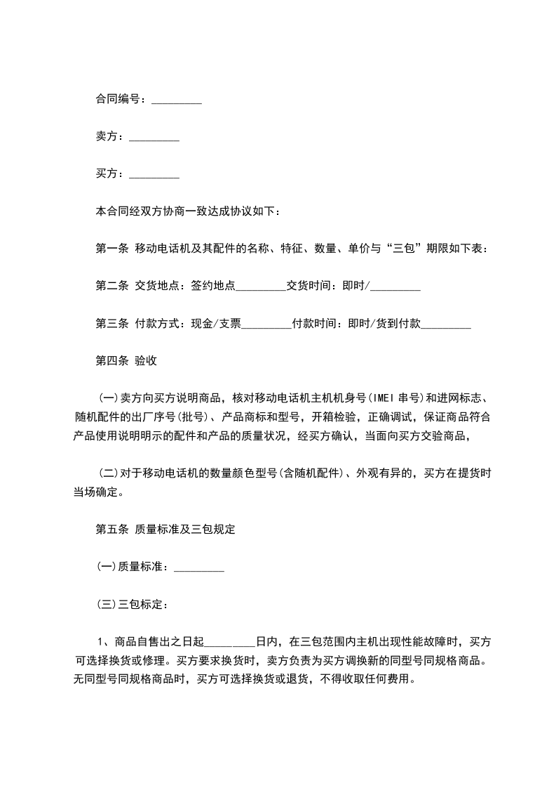 (二)对于移动电话机的数量颜色型号(含随机配件)、外观有异的,买方在提货时当场确定。