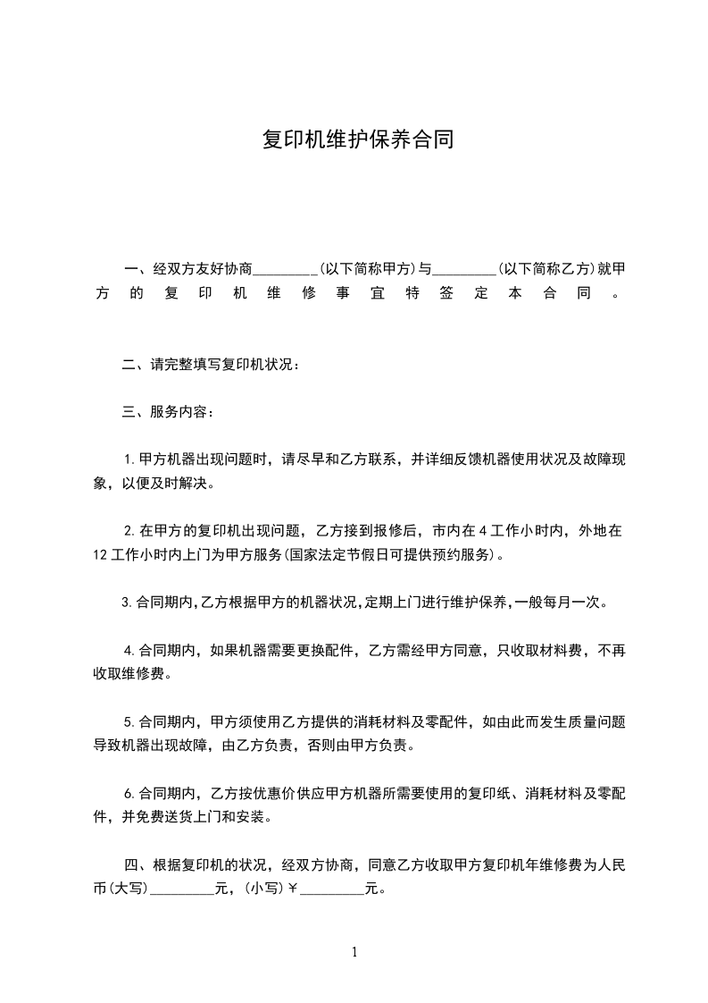 一、经双方友好协商_________(以下简称甲方)与_________(以下简称乙方)就甲方的复印机维修事宜特签定本合同。