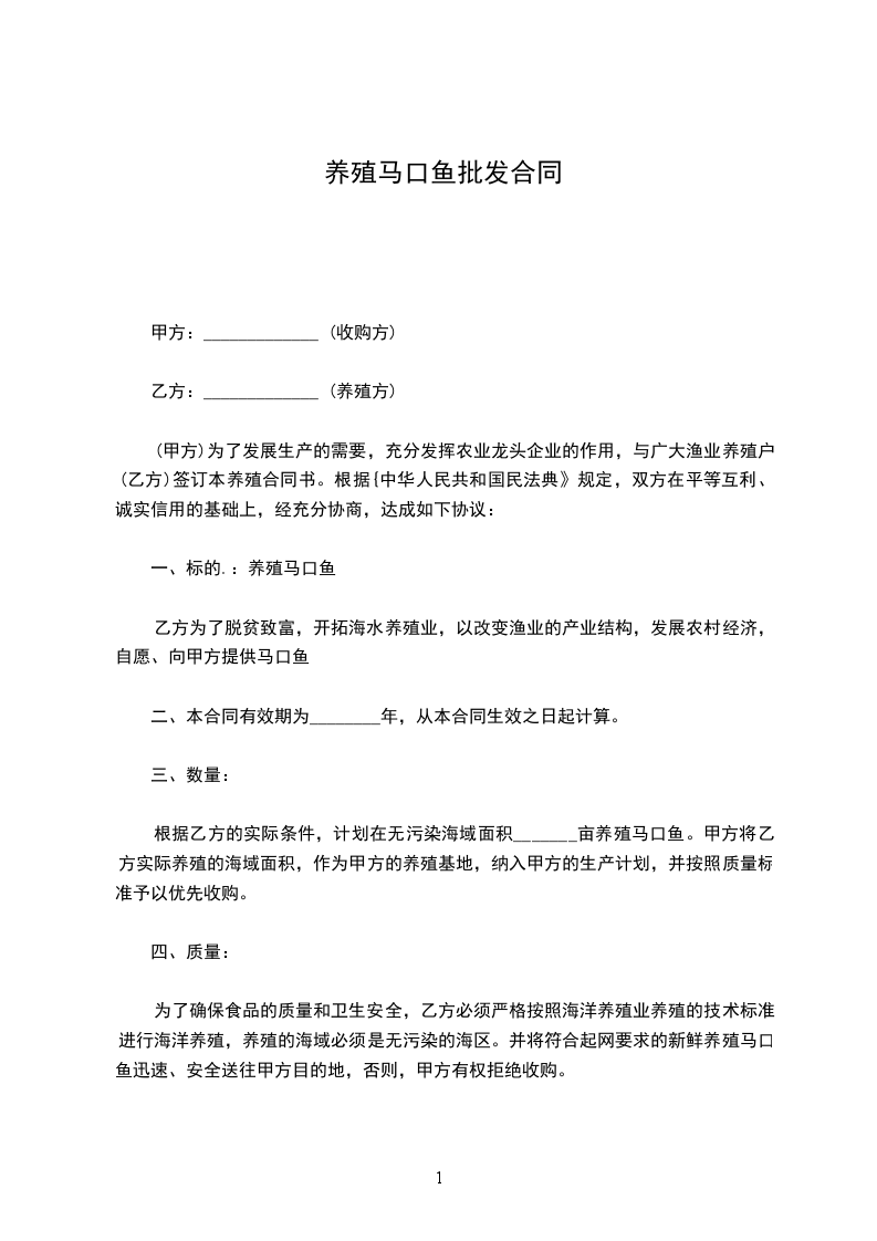 (甲方)为了发展生产的需要,充分发挥农业龙头企业的作用,与广大渔业养殖户(乙方)签订本养殖合同书。根据{中华人民共和国民法典》规定,双方在平等互利、诚实信用的基础上,经充分协商,达成如下协议: