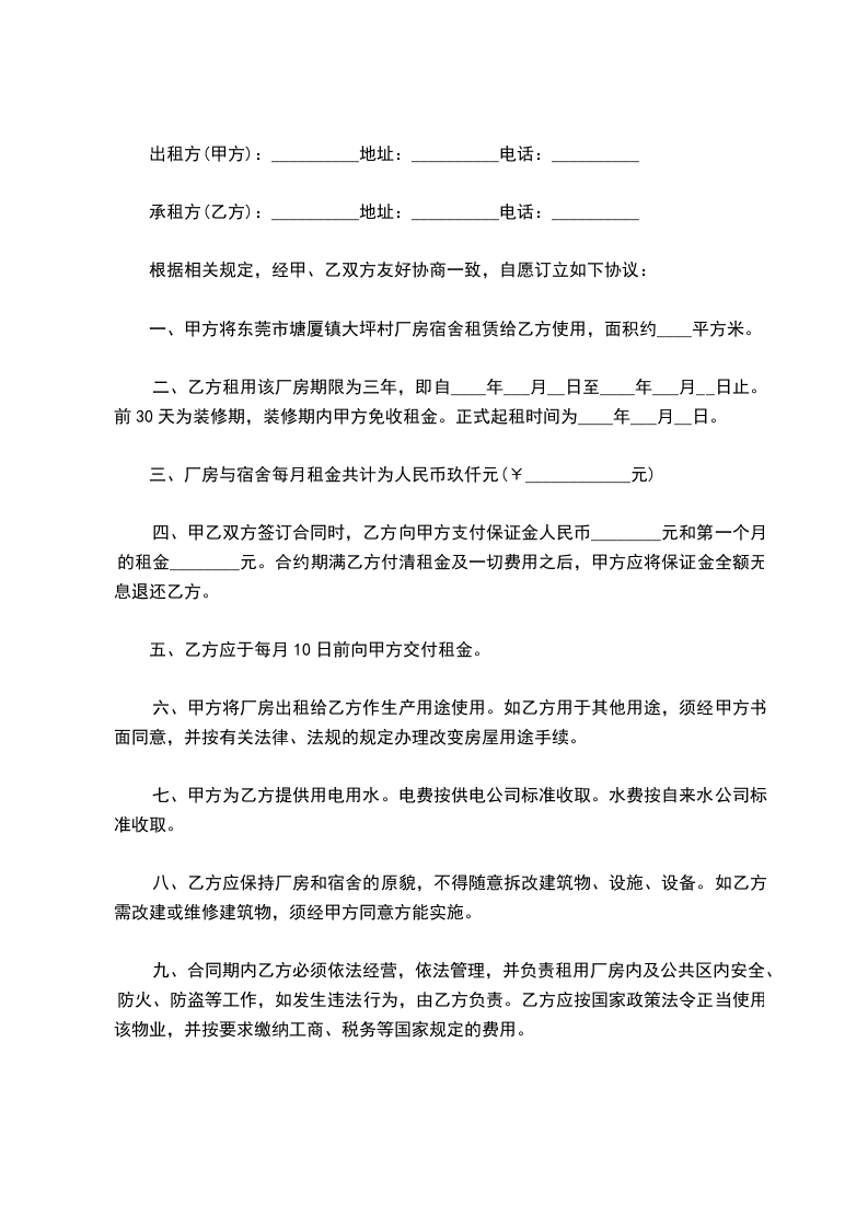 一、甲方将东莞市塘厦镇大坪村厂房宿舍租赁给乙方使用,面积约____平方米。