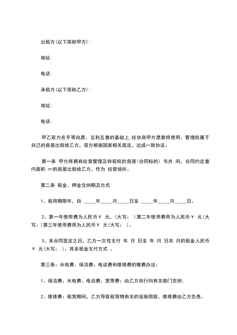 一、甲方同意供给乙方经营用房__________平方米,用于该公司经营之用,该房屋坐落于__________。