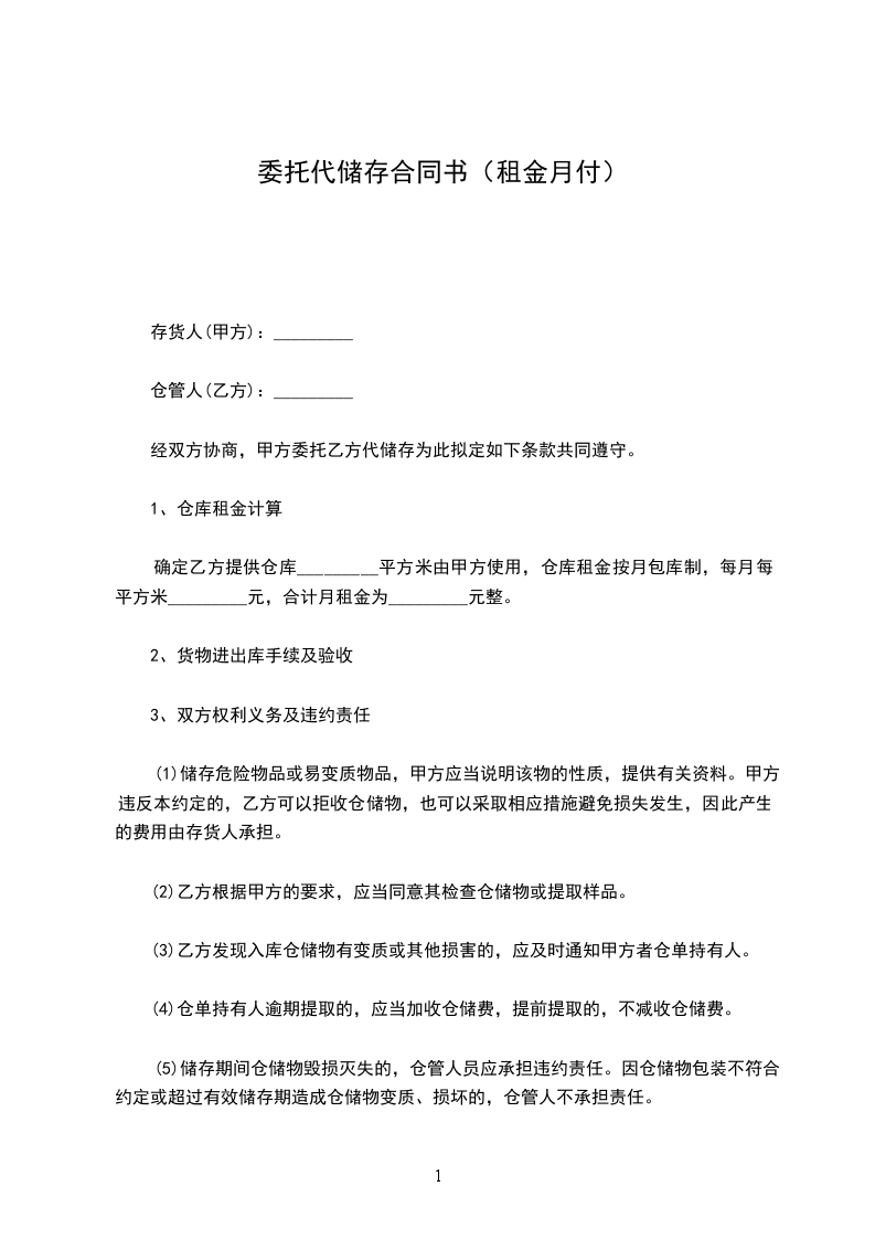 仓库租金按月包库制,每月每平方米_______元,合计月租金为_______元整