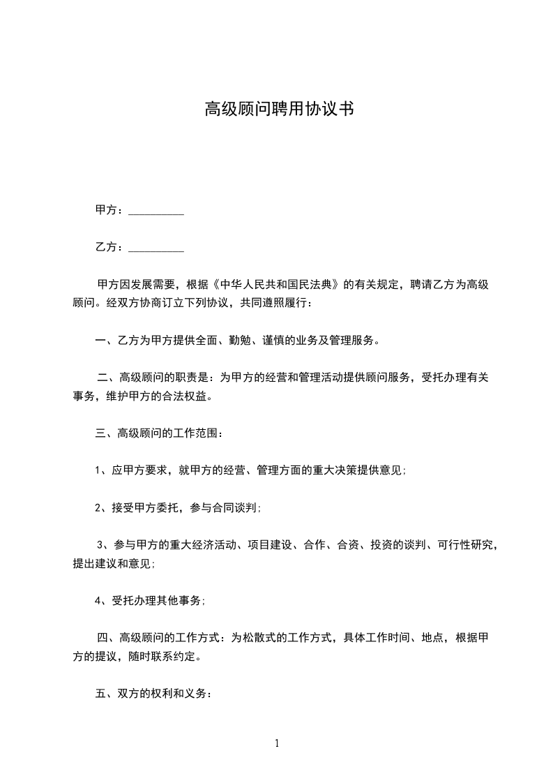 甲方因发展需要,根据《中华人民共和国民法典》的有关规定,聘请乙方为高级顾问。经双方协商订立下列协议,共同遵照履行: