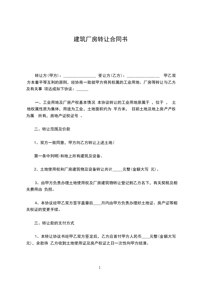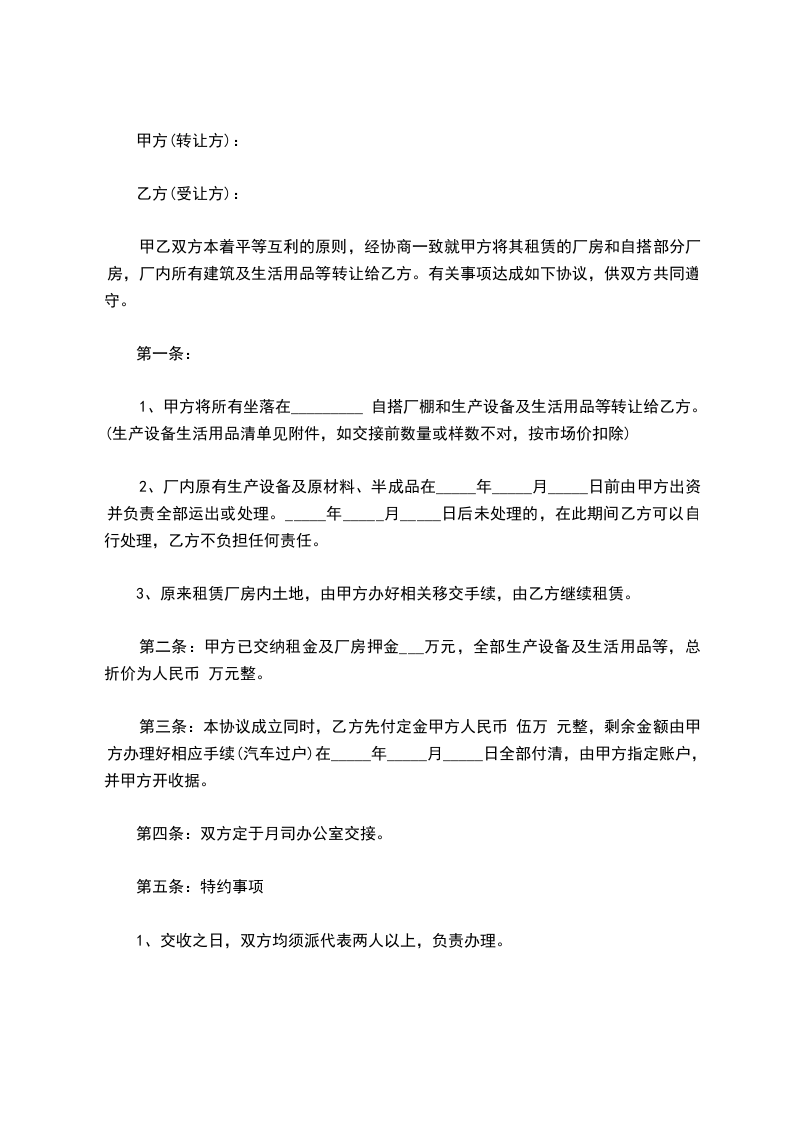 甲乙双方本着平等互利的原则,经协商一致就甲方将其租赁的厂房和自搭部分厂房,厂内所有建筑及生活用品等转让给乙方。有关事项达成如下协议,供双方共同遵守。