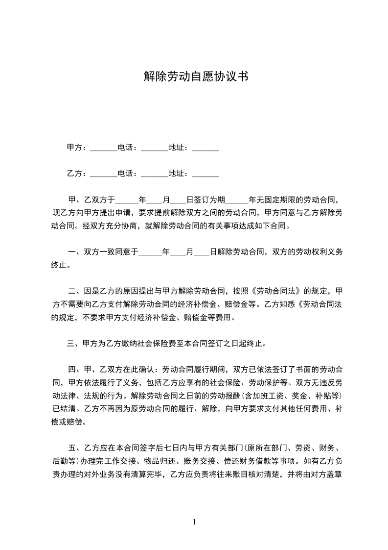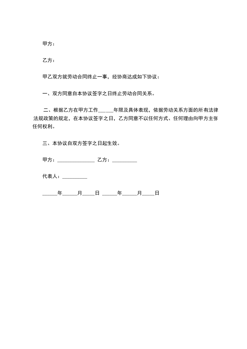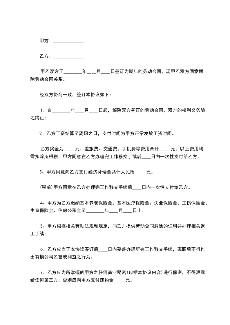 从签订本协议起,甲乙双方原劳动合同即行解除。本协议一式两份,双方各持一份。