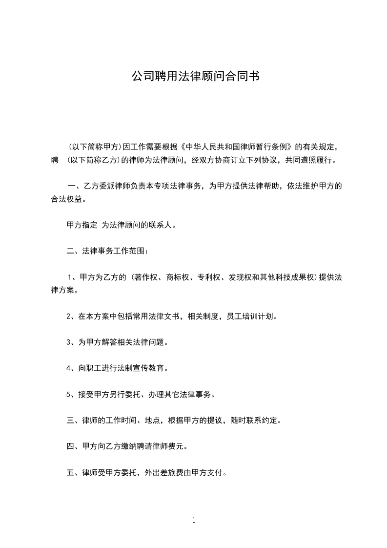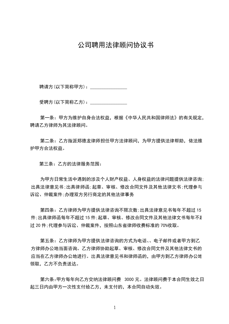 (1)乙方接受甲方的聘请要求,指派_________律师、_________律师担任甲方的常年法律顾问(以下简称"律师")。